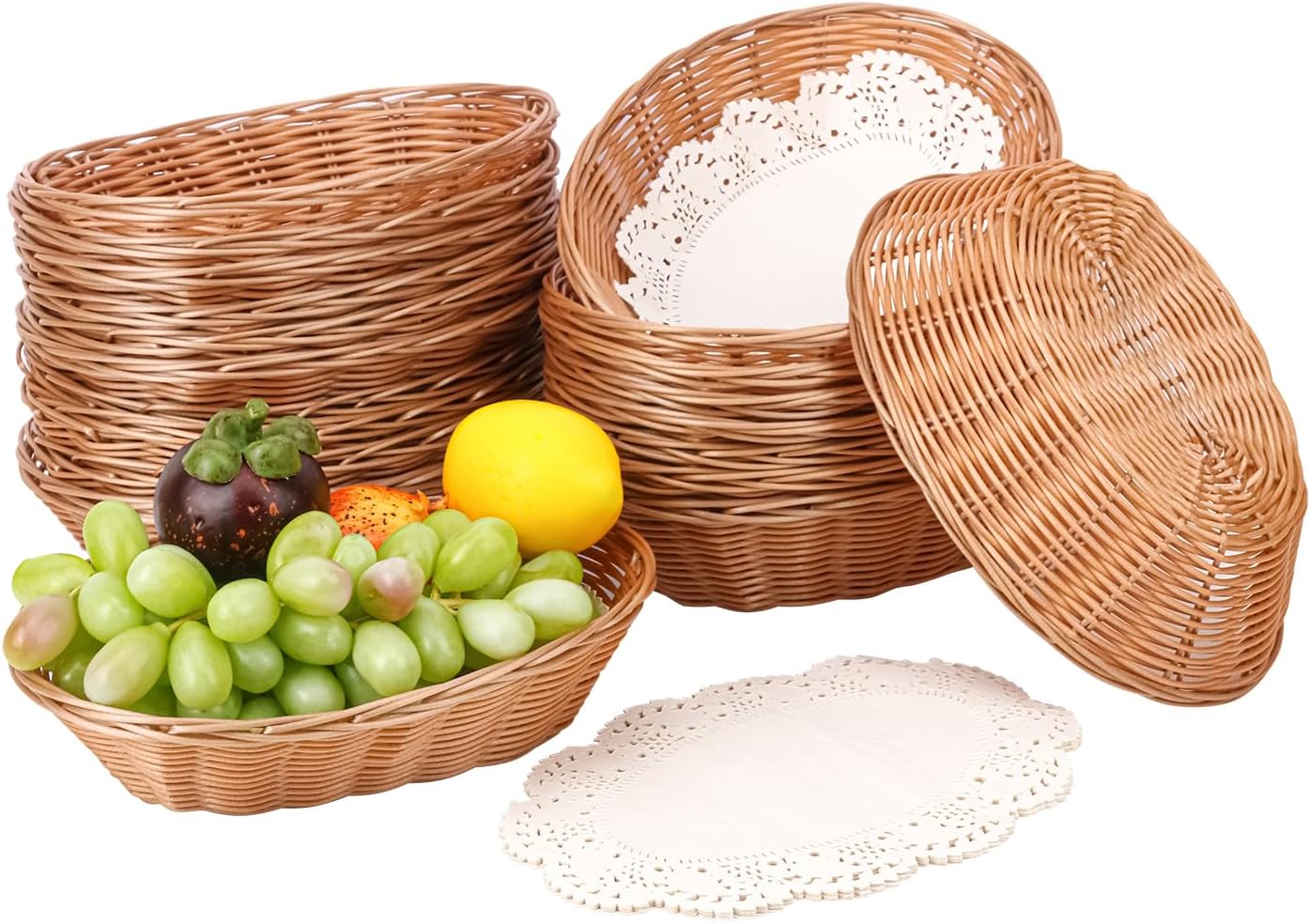 • 【Versatile Use】Ideal for daily use and elegant decorations for parties, these perforated Oval Poly Wicker Baskets allow airflow passage, perfect for storing fruits, vegetables, baked goods, tea, coffee mugs, dinner rolls, bread, napkins, and more.