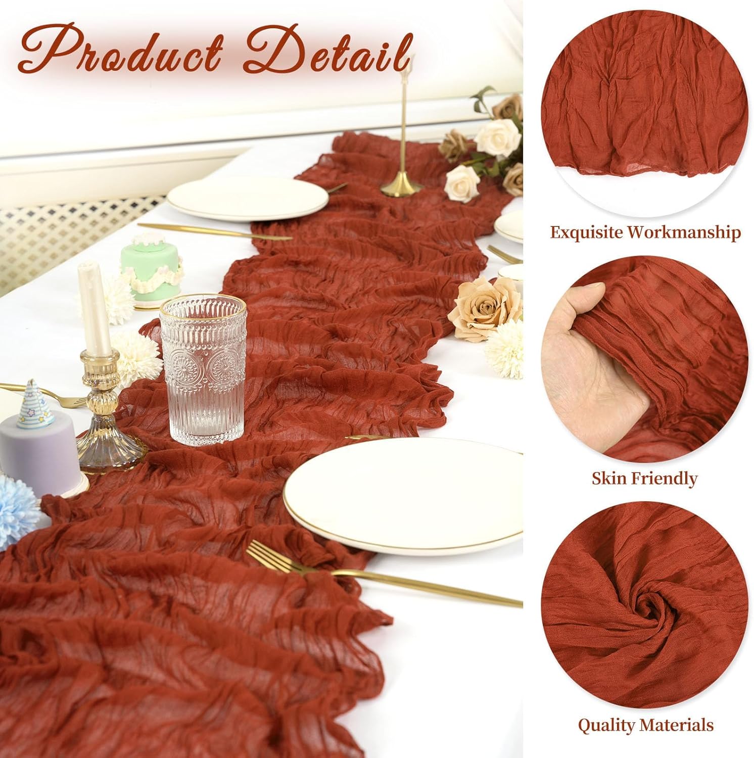 Product Name:20 Pieces Cheesecloth Table Runner 20 x 120 Inch / 55 x 300cmSpecification:Quantity: 20 PiecesSize: 20 x120 Inch / 55 x 300cmColor: TerracottaMaterial: 100% Gauze Cheesecloth FabricStyle: Bohemian RomanticPackage: 20 x Cheesecloth Table RunnerFeature:1.Cheesecloth fabric comes with natural wrinkles, providing a soft touch and an elegant appearance.2.Cheesecloth table runner has a variety of colors and they are fashionable.these color also resistant to fading.Note:1. Due to differences in screen display, there may be slight differences in color.2. If you have any quality issues or misunderstandings with the products you receive, please feel free to contact us at any time to resolve them.3. About product care,suggest hand washing with cold water, air drying naturally, and reduce friction.