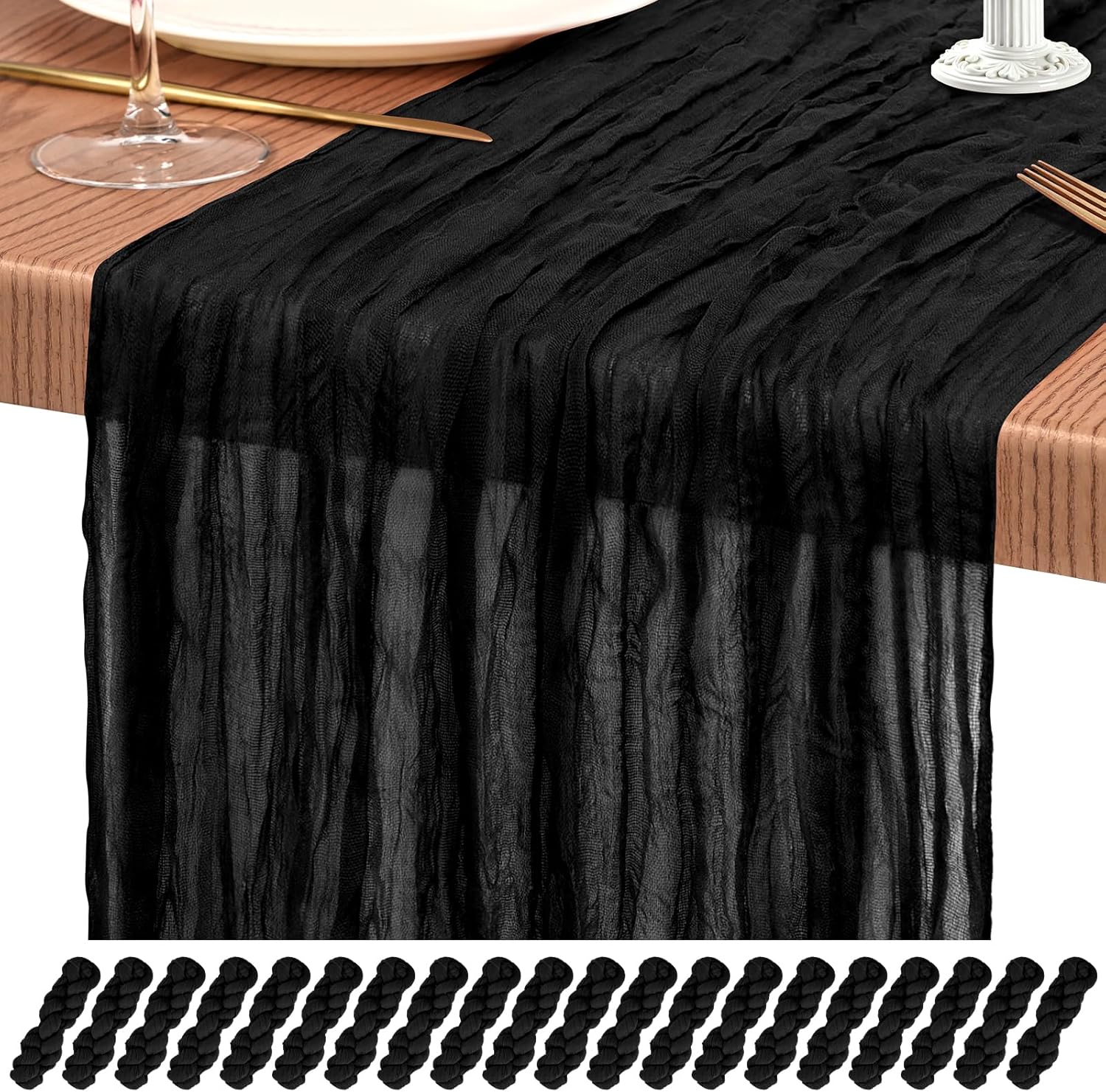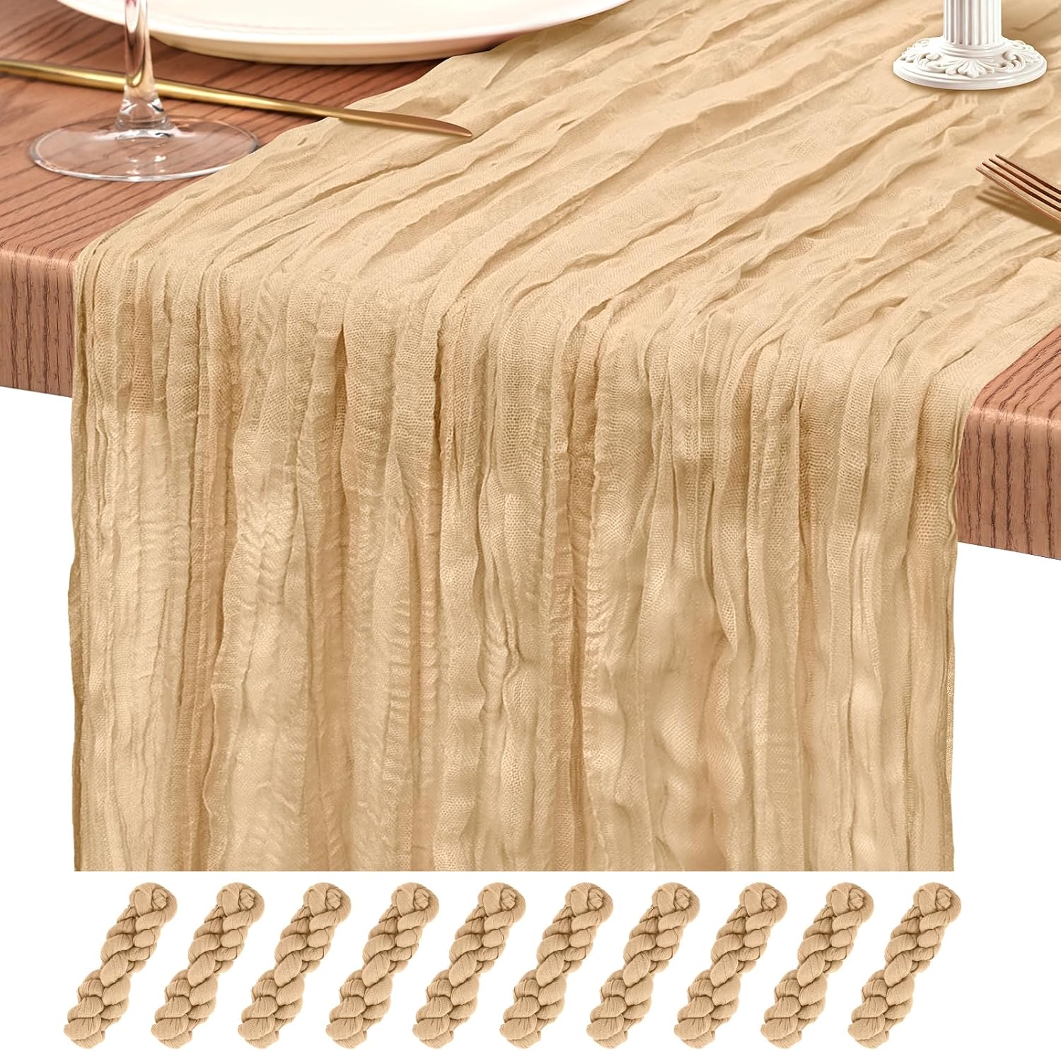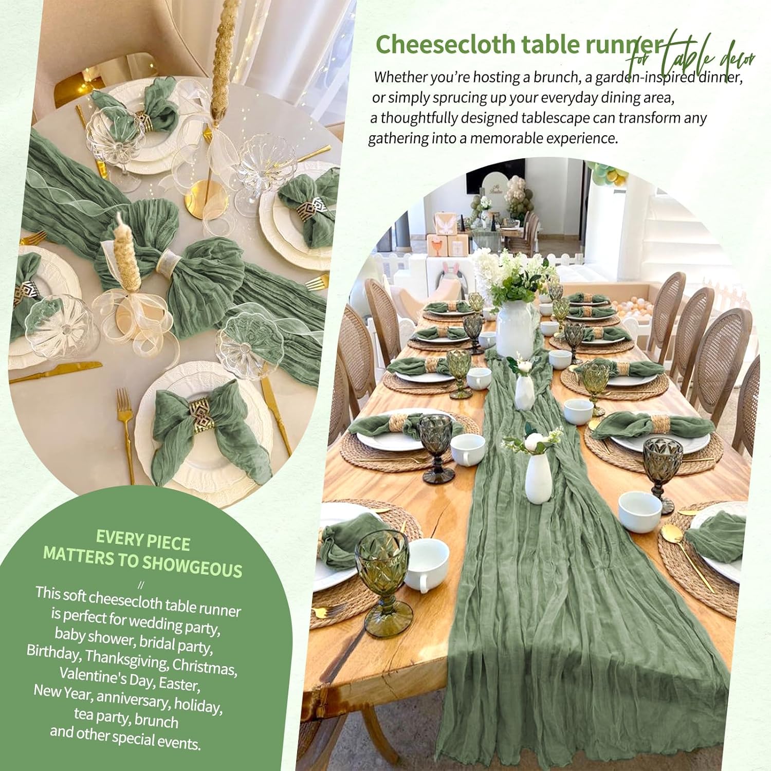 Every Piece Matters to ShowgeousEach set includes 20 pack cheese cloth table runners, measuring 21 x 120 inches (in flat condition), providing ample coverage for your dining table.This ideal size works perfectly for most rectangular and round tables, and can also be used to decorate fireplaces, chairs, curtains as well as wedding arches.FeaturesSoft and ReusableVintage and RomanticSheer and ElegantHandmade and QualityWell-stitched edgesPremium MaterialSage green cheesecloth gauze table runners are made of premium sheer cheese cloth gauze fabric, soft and smooth, hand-dyed from natural material. Washable – colors won't fade with repeated washing. Durable – edges are well-stitched to prevent fraying with repeated use.The rustic boho style with delicate edges and stitches will make your events more romantic and elegant.Exquisite Wrinkled TexturePleating craft, bringing a country farmhouse style to your holiday table decorations, esthetic and lazy, heighten the elegance of the winter tables.Cheesecloth Table Runner for Table DecorWhether you’re hosting a brunch, a garden-inspired dinner, or simply sprucing up your everyday dining area, a thoughtfully designed tablescape can transform any gathering into a memorable experience.Cheesecloth Gauze Boho Table RunnerOur cheese cloth boho table runner is suitable for a variety of occasions, including home decorations, weddings, bridal showers, birthday parties, holiday decorations, baby showers, banquet backgrounds, picnics and important holidays such as Valentine's Day, Thanksgiving, Halloween and Christmas.Showgeous Cheesecloth Table Runner for DecorationsThis rectangular natural pleats gauze table runner has a rustic elegant look, it can be placed on the table or hung on the floor perfectly and elegantly and adds a sophisticated, soft, beautiful touch to your table at any event.