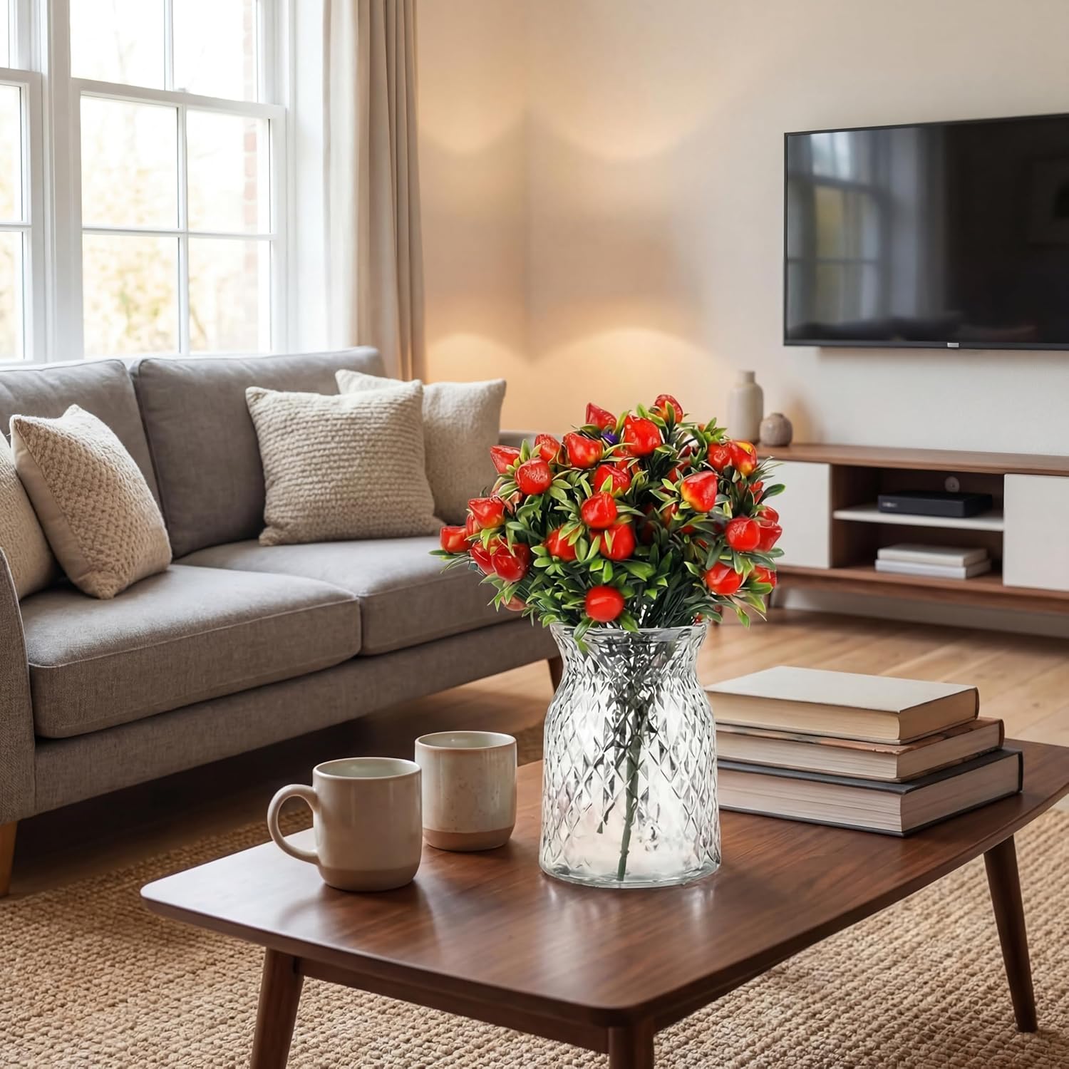 Features: Durable and Flexible: Crafted with plastic branches and wire stems, these branches can be easily bent to suit your desired shape, providing both durability and customizable options in your decorative projects. Realistic Design and Vibrant Colors: Bring a touch of nature indoors with our simulated strawberry branches, featuring bright colors and lifelike designs that effortlessly enhance any decor. Specifications: Material: plastic, foam and wire Color: mainly red and green Size: about 11.81 x 7.09 inches/ 30 x 18 cm Package includes: 20 X artificial strawberry branches Notes: Manual measurement, please allow slight errors on size. The color may exist a slight difference due to different screen displays.