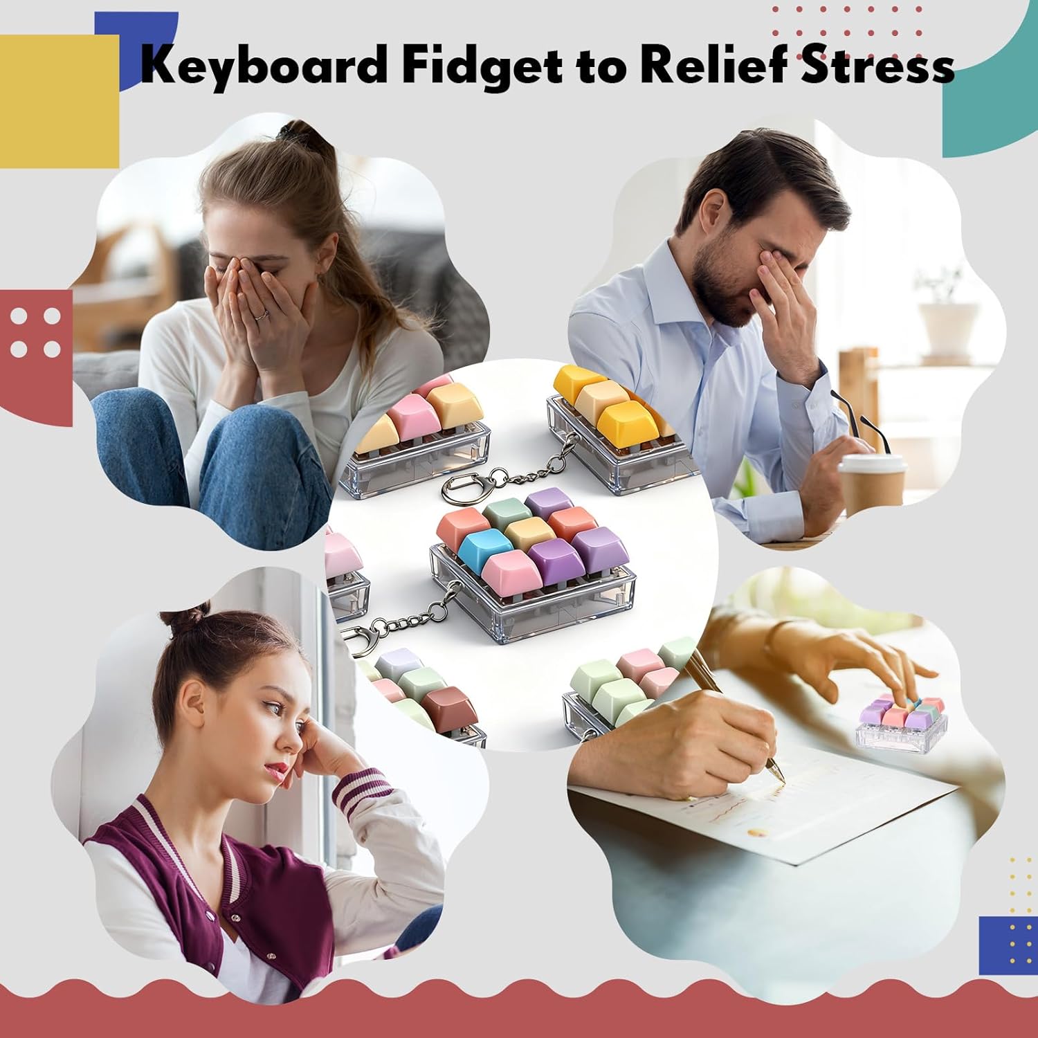 Features: Special gifts for different occasions Keyboard tools are an excellent gift choice for those seeking a subtle but effective way to relieve stress. Their novel design and sensory appeal make them a delightful surprise for friends, colleagues, or relatives who need a bit of tranquility in their daily lives. No Assembly Required These manual fingertip spinners are very easy to use - no batteries needed, no assembly required. Just open the package and enjoy endless peaceful times. For those who want to concentrate or relax their minds, this keyboard stress-relieving tools is a relaxing path for easy relaxation. Specifications: Material: ABS Color: colorful Package includes: 5 x Keyboard fidget Notes: Manual measurement, please allow slight errors on size. The color may exist a slight difference due to different screen displays