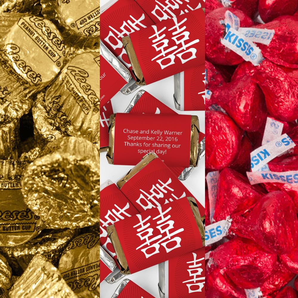 The sweetest addition to your wedding candy buffet, thank you bags, wedding shower guest party favors, or bachelorette decorations. Your friends and party guests will love this sweet little treat after cake, games, and presents! Each kit contains approximately 200 pieces of custom wrapped Miniatures, Kisses and peanut butter cups. Check out all of the custom and bulk designs by Just Candy.