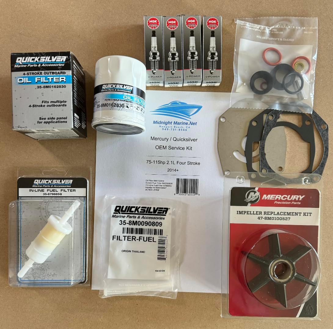 2014+ Mercury Pro XS 75HP 80HP 90HP 100HP 115HP Outboard Four Stoke.Midnight Marine OEM Service Kit includes everything except oil... please view your service manual for oil spec/capacity. All items are OEM Mercury/Quicksilver: Oil Filter 8M0162830 (supersede 8M0065103, 822626Q2, 8M0065104, 8m0162829, 822626) Inline Fuel Filter 879885Q Screen Fuel Filter 8M0090809 Water pump Impeller Kit 8M0100527 (4) NGK ZFR5F (8M0057936, 8M0204728) Gearcase Drain Seals Have questions about fitment??? Just provide us with your engine serial number. Please see the provide attached sample pic as a comparison. Will fit all 2.1L Mercury 4 stroke 2014 and newer. Midnight Marine specializes in delivering high-quality, OEM Mercruiser service maintenance kits tailored to streamline boat maintenance. Each kit includes all essential parts needed for routine servicing, making it easy, efficient, and cost-effective to keep your vessel in top shape. We understand the importance of a perfect fit, so if you provide your engine serial number, we’re more than happy to confirm compatibility, ensuring you get exactly what you need. Trust Midnight Marine for reliable products that support smooth, hassle-free boating experiences every time.