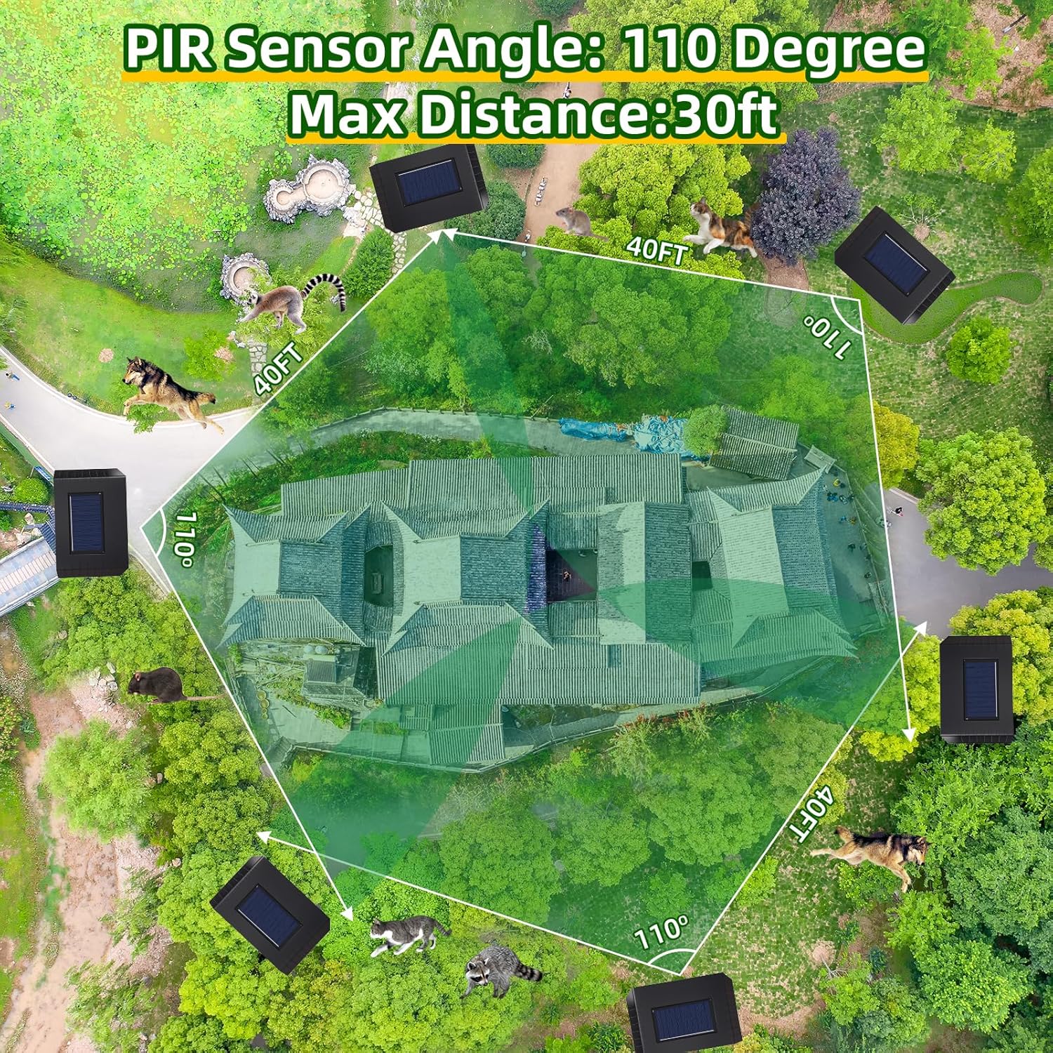 Please Be Informed Before Purchasing: It is recommended to install 3 inches above the ground to avoid being soaked in water. Please install in a sunny area. If the animal walks over from behind or stands on top of the skunk repellent for yard, this cat repellent outdoor will not trigger the animal repellent. The trigger of the deer repellent devices is within a range of 120 degrees from the front. We suggest you purchase multiple sets, with a 3-sided surround installation on the ground. Please be informed that our ultrasound equipment emits multiple different frequencies of sound waves continuously, causing animals to gradually feel uncomfortable unconsciously and voluntarily move away from the area. This process aims to achieve a long-lasting and gentle humanized driving repelling effect, which usually takes about three weeks to gradually manifest. During this period, animals may still turn back, please be patient to fully observe and experience this effect. Specifications: Type: solar ultrasonic animal repellent outdoor Color: green Ultrasonic version: 2025 version Charging method: solar powered Drive angle: 120 ° Package Includes: 4 x solar ultrasonic animal repellent outdoor 1 x English manual