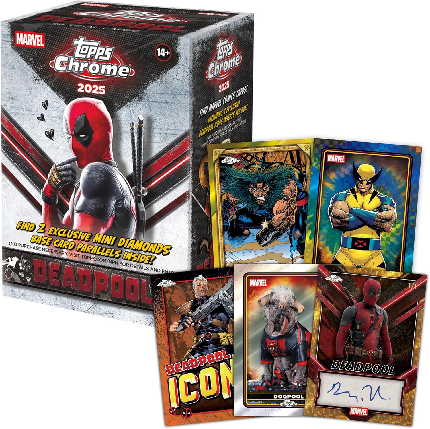 4 cards per pack, 7 packs per box. Find 2 exclusive mini diamonds base card parallels. Unleash the full chaos of Wade Wilson with 2025 Topps Deadpool Chrome, a must-have trading card release celebrating Deadpool’s rich comic and cinematic history. Featuring a dynamic 100-card Base Set, dazzling Chrome parallels, rare case hits, sketch cards, original artwork, and autographs from stars like Ryan Reynolds and Hugh Jackman, this product delivers a wild mix of comic book mayhem and big-screen action. Celebrate the legacy of Deadpool with inserts and parallels that spotlight his comic book roots, including Comic Book Gold, Cover Stars, and original art inserts like Topps Originals. Explore his cinematic evolution with film-inspired sets like Best Bubs. From iconic comic book art to unforgettable moments from Deadpool & Wolverine, this set is as unpredictable, hilarious, and collectible as the Merc with a Mouth himself.