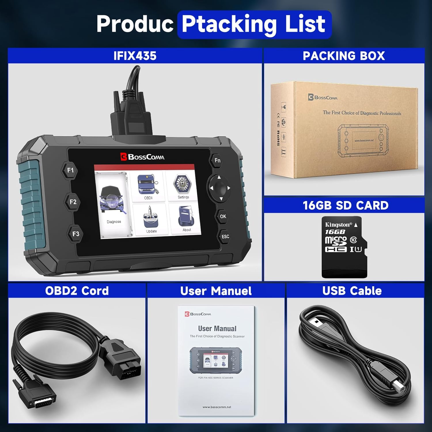 | Included Components | 1* Easy-to-Read User Manual, 1* IFIX435 OBD2 Scanner, 1* OBDII 16 Pin Connection Cable with Your Car, 1* SD Memory Cards, 1* USB Cable for Connection with Your Computer |