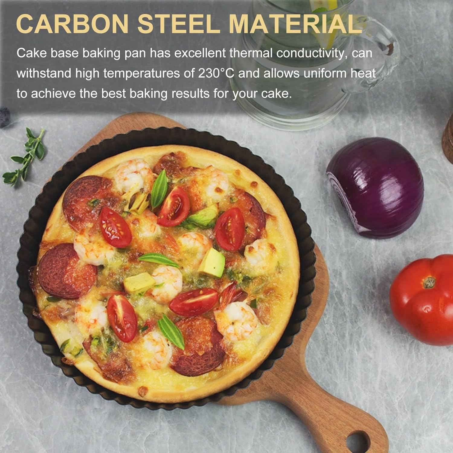 The pie pan is made of high-quality carbon steel material, which is not easy to be deformed by heat and can withstand high temperatures of 230°. The size of the tart pan removable bottom 28cm×3cm is perfect for making cream cheesecakes, chocolate cakes, quiche muffins, pizzas, pies, cakes, cupcakes, brownies, and other delicious desserts. In addition, the detachable chassis design ensures that the quiche retains its shape and is easy to remove when unformed, and the wavy grooves around the edges add surface area to the sides, which in turn creates a sturdy crust that makes the cake easier to shape. The pie pan has a non-stick coating, the pie pan has a smooth internal surface, the cake is easy to demold, and it is easy to clean. Cleaning tip, please do not use utensils with steel wool to clean, you can use silicone cleaning tools or hand washing to prolong the service life.