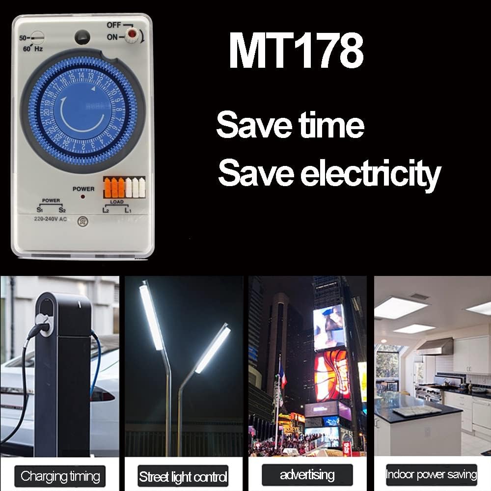 Type:Timer SwitchModel Number: MT178Theory: MechanicalMovement:AC typeRated Voltage:200-220Vvoltage Tolerance:170-240VFrequency:50/60Hz(selection type)Power Consumption:1.5wTime precision:Same as AC frequencyAmbient Temperature:-10°C~+50℃Resistive Load:250VAC 15ALamp Load:10OVAC 150OW 200VAC 3000wInductive Load:10A(cosp=0.7 or more)Motor Load:100VAC 750W 200VAC 1500wMinimum setting unit:15 minute unitsMinimum setting interval:30 minutesNo of ON-OFF operations:Standard 6 operations Maximum 48 operations are possible.Package contains: 1* Timer SwitchNote: Light shooting and different displays may cause the color of the item in the picture a little different from the real thing. The measurement allowed error is +/- 1-3cm.