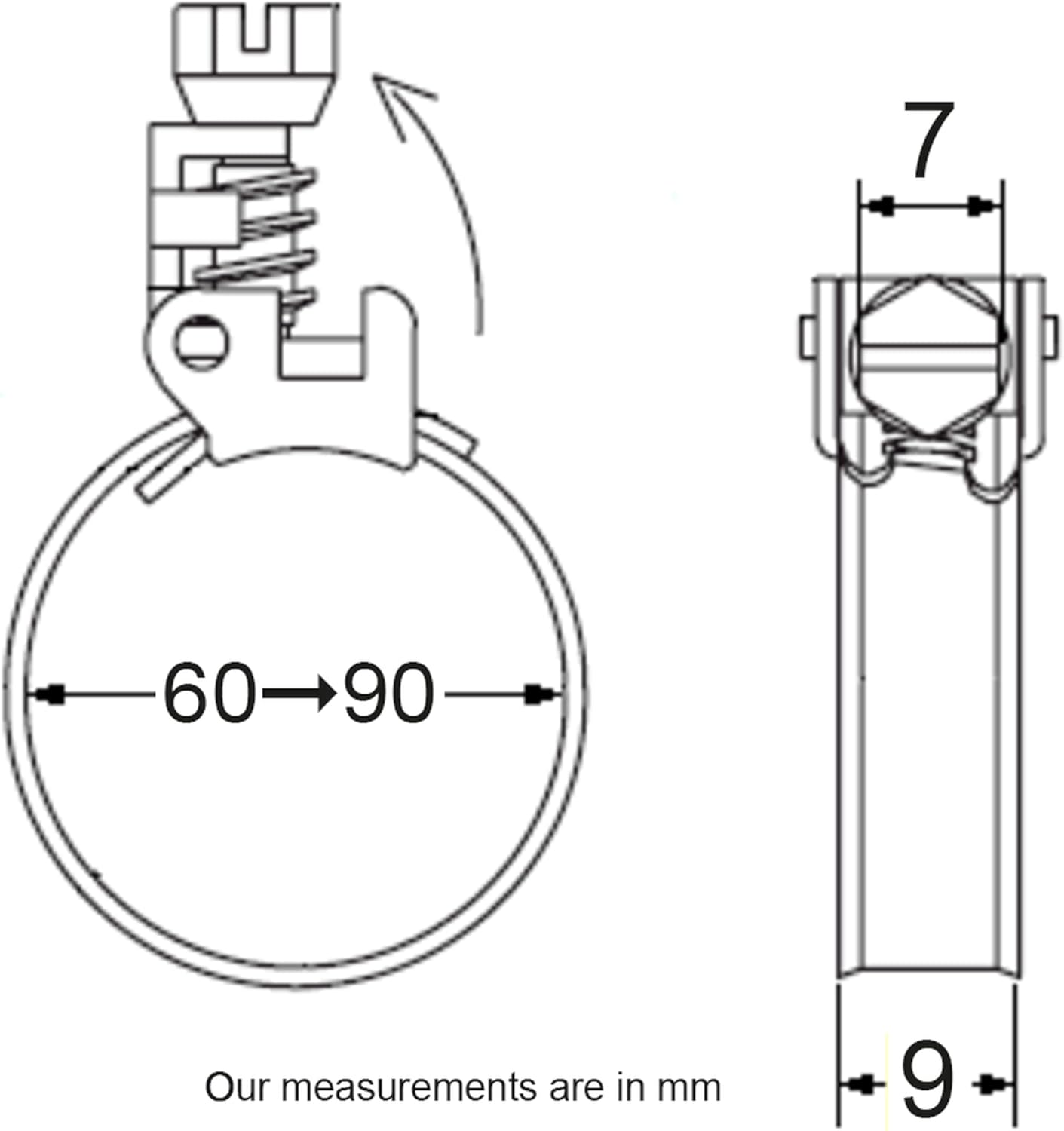 Screw head collar A fixing solution for automotive and industry. Made of high quality materials. It is durable and durable. Multi-purpose collar with an extended clamping range For standard applications such as machine building, sanitary, household appliances, fuel lines, commercial vehicles. Material: X6Cr17 1.4016 stainless steel. Clamping diameter: 60 - 90 mm. Necklace width: 9 mm.