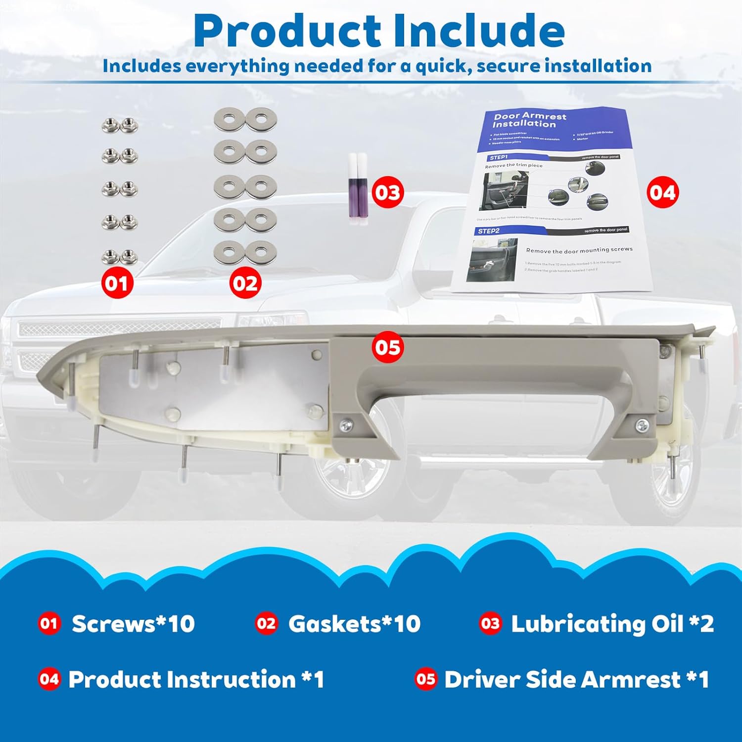 | Included Components | Driver Side Armrest x1, Gaskets x10, Lubricating Oil x2, Product Instruction x1, Screws x10 |