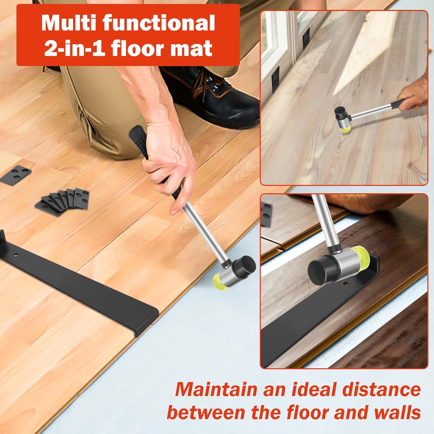 Parts List:1 x Pull Bar1 x Tapping Block1 x Hammer20 x SpacerDescription:This wood floor installation kit contains the essentials you need, making your installation more convenient and easier. It is a must have for DIY or professional use.Key Feature:You Will Receive: You will receive 1 pull bar, 1 tapping block, 1 double faced hammer and 20 pieces spacers.Specification:Product Name: Wood Floor Installation KitSize:Hammer: 26x7.6cm/10.23x2.99inchPull Bar: 26.5x4.8cm/10.43x1.89inchMaterial: IronColor: BlackNote:1.There may be slight differences between the picture and the actual color of the commodity. We will try our best to show you the exact color.2.Please allow slight dimension difference due to manual measurement.