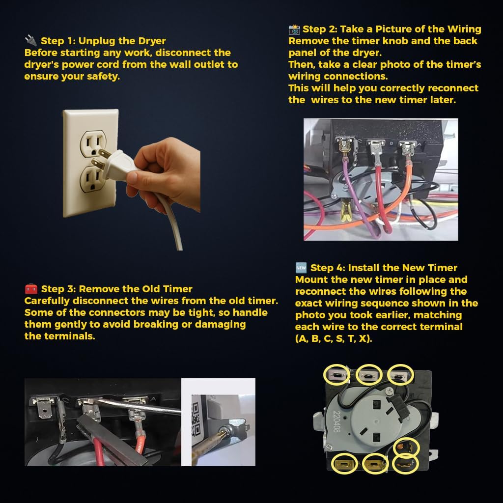 The WE04X24550 timer from GE Appliances is a genuine replacement part designed to control the electrical components and duration of cycles in dryers. Made with high-quality materials, this timer ensures long-lasting and reliable performance, keeping your dryer running optimally. Before installation, it is recommended to disconnect the dryer from the power source and wear work gloves for hand protection. This product comes with a one-year limited warranty. Compatible models: GTD42GAMJWW, SGN47N5XNBAB0, GTD42GASJWW, SGG47N5XNBAB0, GTD42EAMJWW, GTD42GAMJWW, GTD42EBMKWW, GTD47EBALDG, GTD42EAAJW, GTX42EASJWW, SGE47N5XNSBH0, GTD42GBMKWWW, ETD48XGASWWB, PS11763064, AP6031056, XTD72E8SSTWS and more