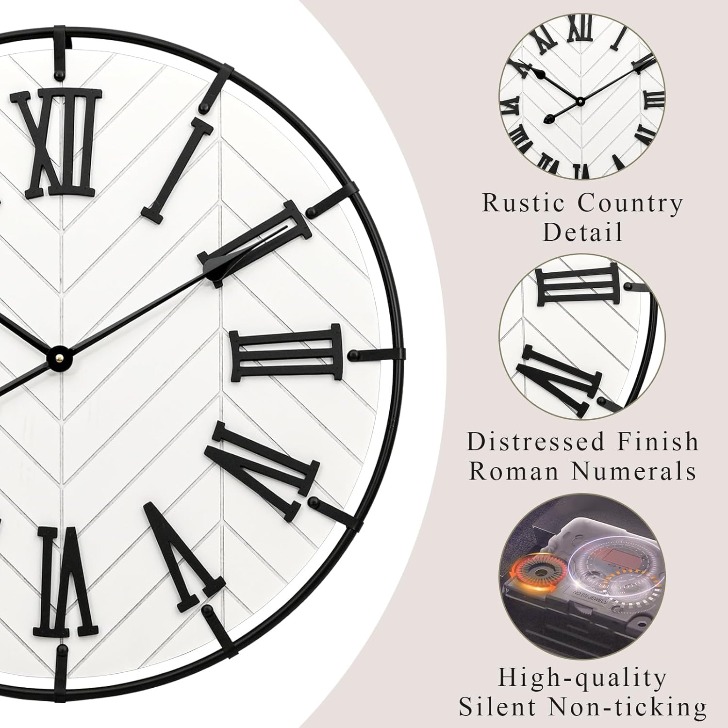 EMAX HOME 24 Inch Large Wooden Wall Clock – Extra Large Farmhouse Wall Clock with 3D Roman Numerals, Modern White Round Wood & Metal Clock for Living Room, Silent & Accurate Timekeeping