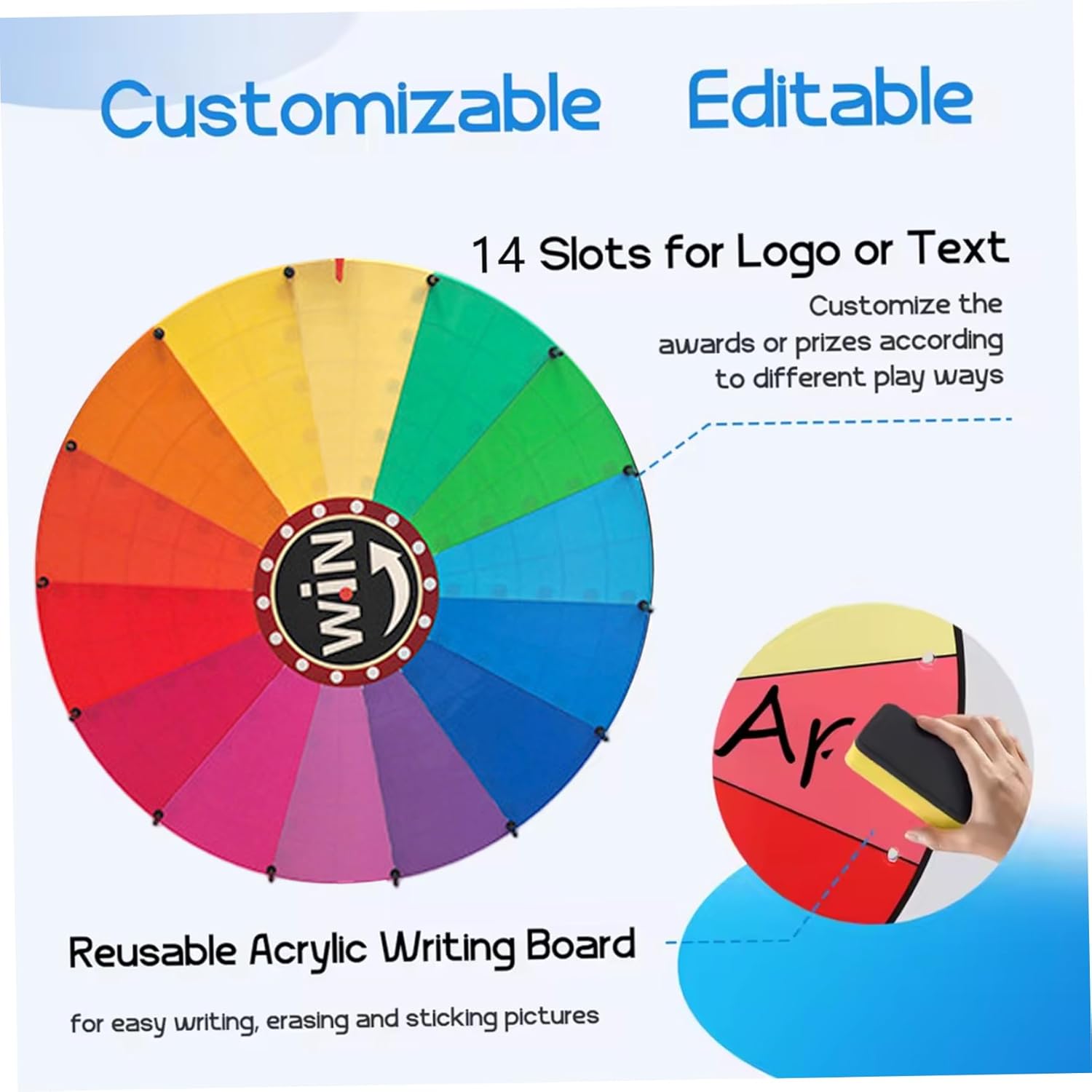 Description: This 24 Inch Prize Wheel with 14 vibrant color slots makes an engaging and visually appealing game experience suitable for both adults and kids. The adjustable tripod stand ensures stable support and customizable height for versatile placement, whether in classrooms, parties, or promotional events. Equipped with dry erase markers, an eraser, and a built-in tray, this spin the wheel game allows quick and easy customization of prize categories, enhancing interactivity and excitement. Made from sturdy materials, the spinner wheel is built to withstand frequent use while remaining lightweight for easy transport and storage. Ideal for prize giveaways, educational activities, or fun competitions, this spinning wheel promotes social interaction and joyful participation while meeting the needs of various event organizers and game facilitators. Its user-friendly design and reliable construction make it a top choice for anyone looking to add dynamic incentives and a lively atmosphere to any gathering. Features:. -Color: Colorful. -Material: Steel. -Size: 61 cm/24 inch. Adjustable Height 100-165 cm/39.4-65 inch. Note:Manual measurement, please allow slight errors on size.The colors may exist slight difference due to different screens. Package Including 1 * Prize Wheel
