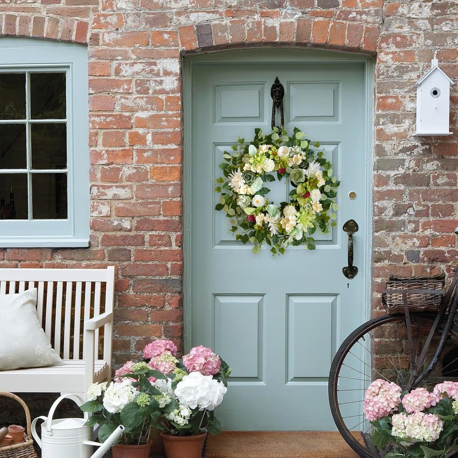 This wreath is crafted with high-quality imitation techniques to accurately reproduce the shapes of peonies, hydrangeas, eucalyptus leaves, and other flowers and leaves.The white and green gradient color scheme is fresh and elegant, and the richly layered arrangement of flowers and leaves makes the wreath look like a vibrant natural flower arrangement from a distance, bringing a visual enjoyment of spring-like beauty all year round to your home.The full and plump shape with a diameter of 24 inches is highly versatile. It can be used as an entrance greeting decoration, hung on the wall of the living room, above the fireplace, or as a center decoration for the dining table.Whether it's to welcome guests, embellish the home, or serve as a gift for moving house or special occasions, it can be a striking highlight in the space.The fresh white and green color scheme combines French romance and rural charm.It can be perfectly integrated into modern minimalist, American country, or Nordic style homes. From daily home decoration to weddings, parties, and other special occasions, it can add a gentle and elegant style to the space