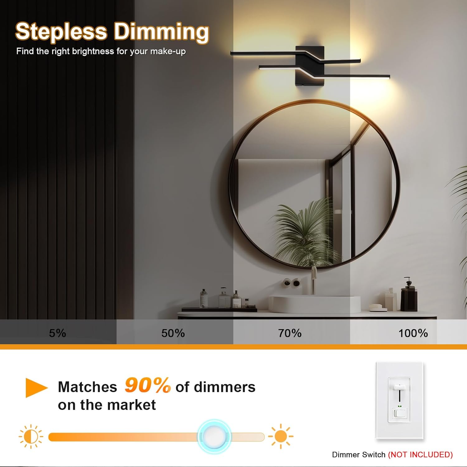5 CCT & dimmable black bathroom light fixture : Vanity mirror lights upgraded 5 Color Temperature(2700K/3000K/3500K/4000K/5000K), custom color temperature lighting, warm white or cool white. No need to worry about choosing color temperature, one set is all done. Smooth Dimming: led vanity light compatible with most LED dimmers on the market. You can achieve adjust brightness(10%~99%) with the household dimmer switch. (Dimmer switch is NOT included in this kit)" Energy save lights for mirror:High quality led mirror lights with feature of energy saving, 24W integrated led light source Eqval. to 200W traditional bulb, creates stable and efficient led vanity light,less power but more lumens, ensure this bathroom vanity light with less power consumption comparatively. Horizontal/Vertical Installation: Install the entire fixture horizontally above wider mirrors or vertically alongside taller mirrors – the choice adapts to your specific layout and space constraints. It's a great lighting addition for bathroom. Wide Application: Perfect for you indoor bathroom fixtures as vanity lights for mirror, dressing table mirror lights for makeup, led lights for bathroom cabinet, restroom lights for vanity mirror , powder room wall light fixture etc. WORRY-FREE SERVICE:We provide a complete 2-year warranty for wall lamps. If you have any questions about our lights, please feel free to contact us at any time.