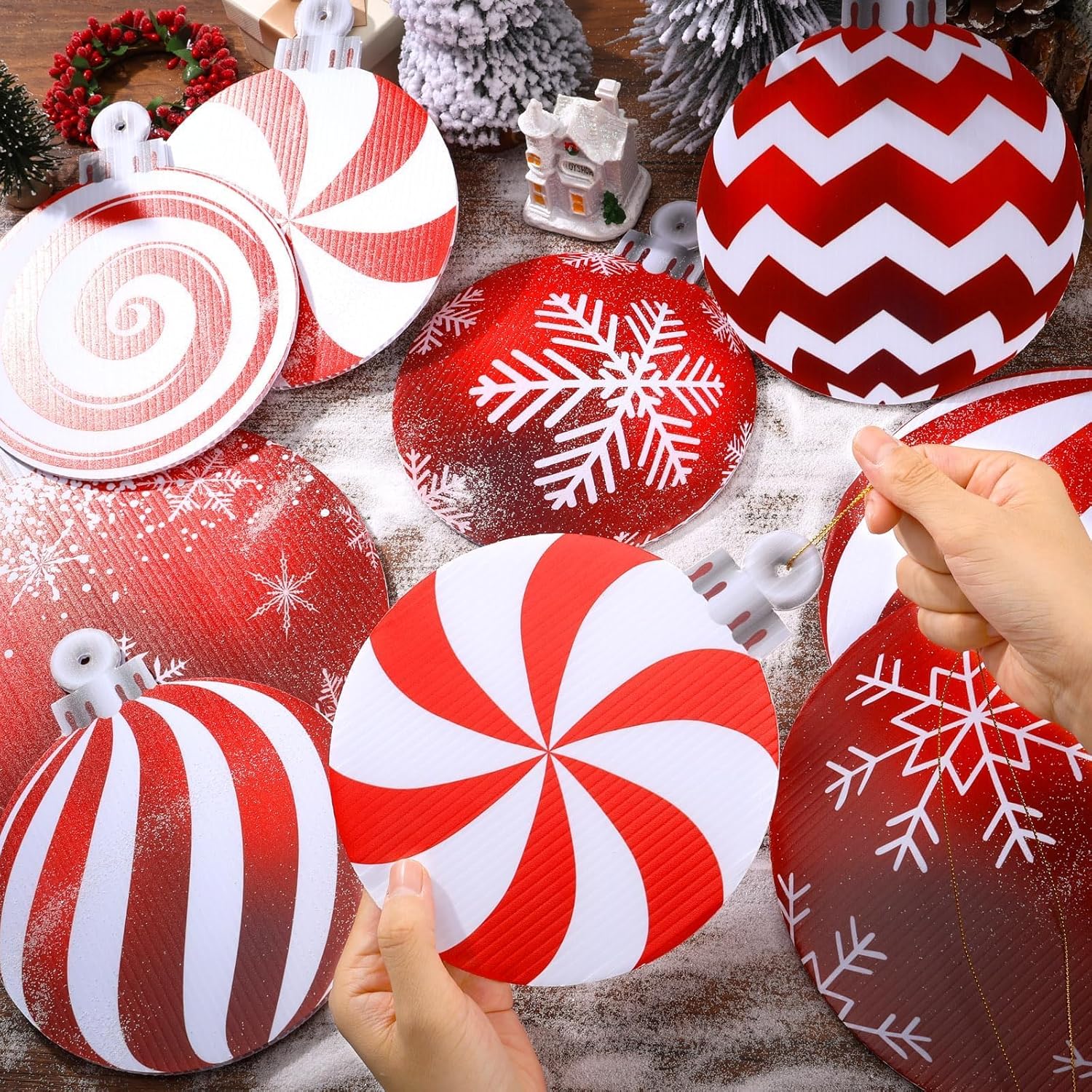 24 Pcs Large Christmas Ornaments 9 Inch/6 Inch Double Sided Outdoor Christmas Decorations Oversized Holiday Yard Decor for Xmas Tree Yard Lawn DecorFeatures: Unique Design: Our Christmas tree decorations come in 12 beautiful styles, the red color is fit for Christmas and the white pattern is beautiful and elegant; creating more jubilant atmosphere. Reliable Quality: The Christmas yard signs are made of waterproof plastic material, sturdy and solid, will not tear or break easily, not easy to fade, and can be used for a long time. Specifications: Color: as pictures shown Material: Plastic Size: as pictures shown Package includes: 24 x Outdoor Christmas Candy Ornaments Note: The colors may exist slight difference due to different screens. Manual measurement, please allow slight errors on size.