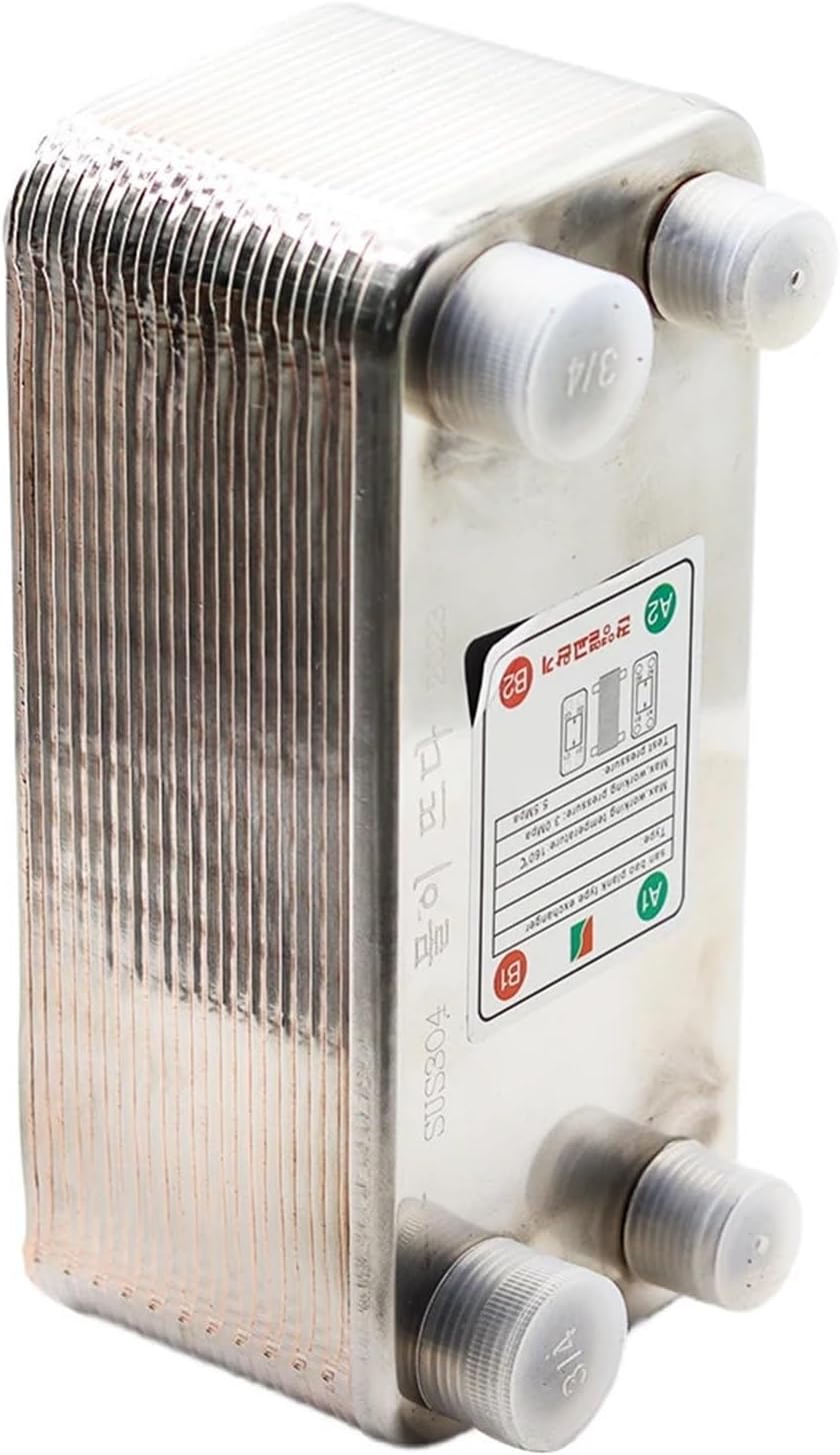24 Plate Heat Exchanger Beer Wort Chiller Cooler SUS 304 Stainless SteelMaterial:SUS 304 Stainless Steel (Food Grade)WeldIing Material:99.9% CopperApplication:Home Brew Wort Chiller,Famliy Hot Water supplyThread of Port A1,A2:1/2" BSPT MaleThread of Port B1,B2:1" BSPT Male Or 3/4"BSPTPlates Number:24Denension:195x85x75mmHeat Transfer Area/plate:0.028 m2(0.30 ft2)Thickness of One Plate:0.25-0.35mmMax Flowrate:12 m3/HThe Maximum Pressure: 1.6Mpa(228 PSI)Refrigeration Capacity:5 KW(1465 BTU/hour)Working Temperature:-160 to + 185 Using Way for hot Wort:Port A1:Hot Wort,Port A2:Cold WortPort B1:Cold Water,Port B2:Hot WaterThe flowrate of Cold Water higher the Better.Using Way for Famliy hot water supply:Port A1:Cold Water,Port A2:Hot WaterPort B1:Central heating In;,Port B2:Central heating Out