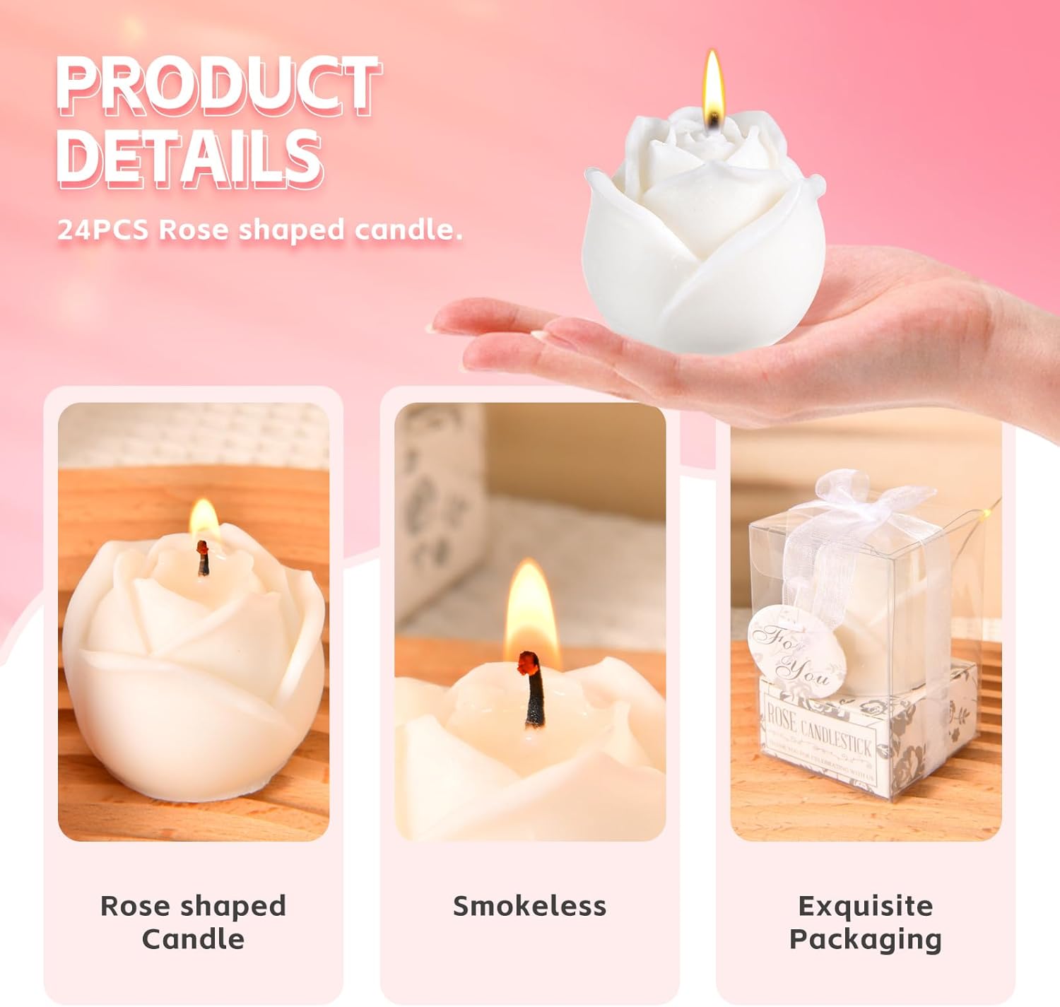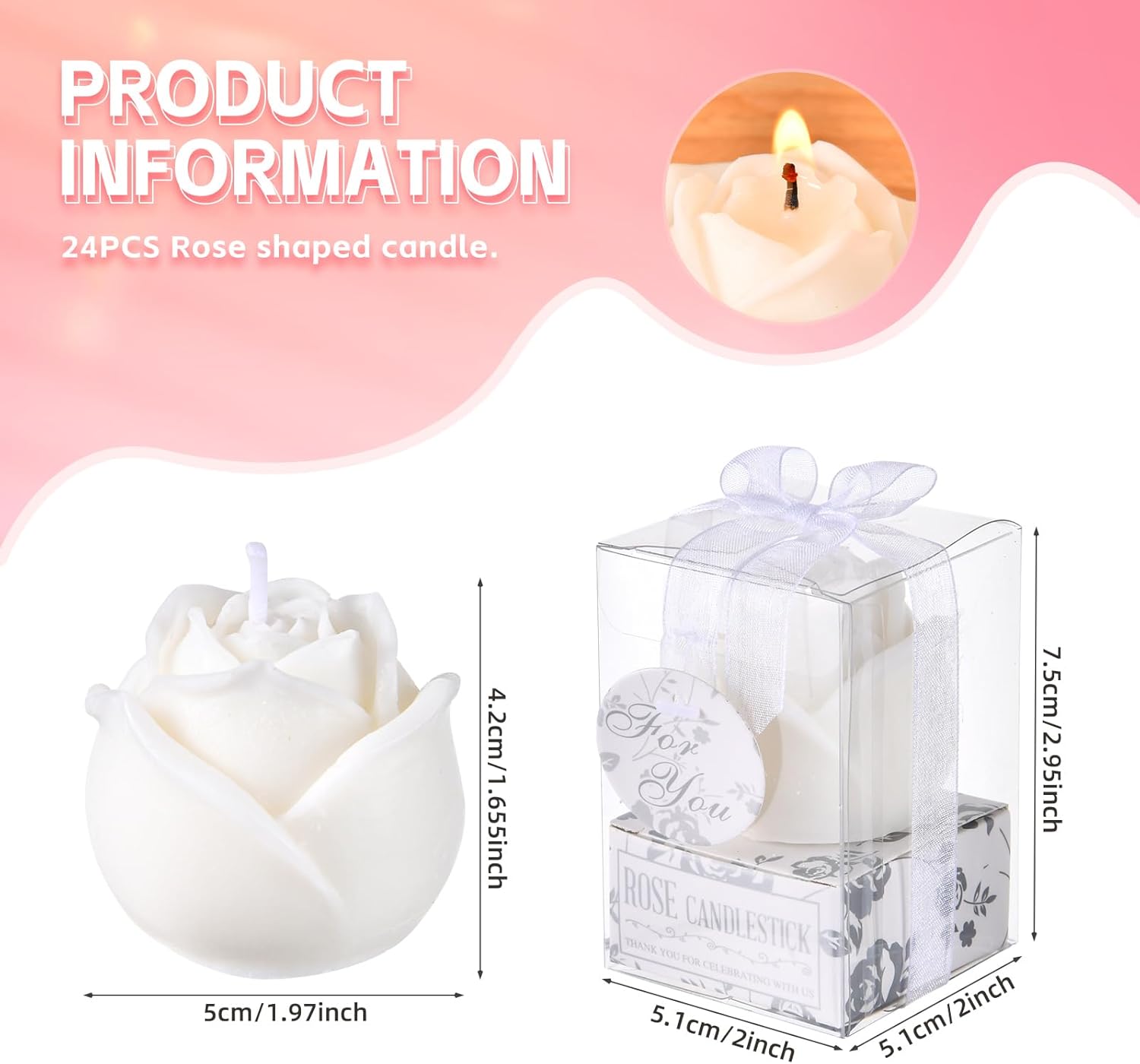 Specifications: Package includes: 24Pcs Wedding Rose Shape Candles Material: High Quality Wax Candle Size: 3.7 × 4.5cm/1.5 × 1.7inch Packaging Size: 4.5 × 4.6cm/1.7 × 1.8inch Color: White Product Characteristics: Made of high-quality wax, odorless,reusable, providing you with a long-lasting and comfortable user experience. Each elegant candle is carefully handmade with attention to detail, ensuring a unique and exquisite addition to your festive decorations. Safe to burn, it can burn cleanly for 2-5 hours without wind, not only illuminating your room and meeting your daily needs, but also serving as a home decoration. The design of the candle is full of rose, creating a romantic and warm atmosphere. The base design allows it to be easily and smoothly placed in the center of the dining table or anywhere. This rose candle is themed on love and romantic, suitable for various occasions, such as bridal gifts, weddings, birthday, anniversaries, souvenirs, etc. Notes: Manual measurement, please allow slight errors on size. The color may exist a slight difference due to different screen displays.