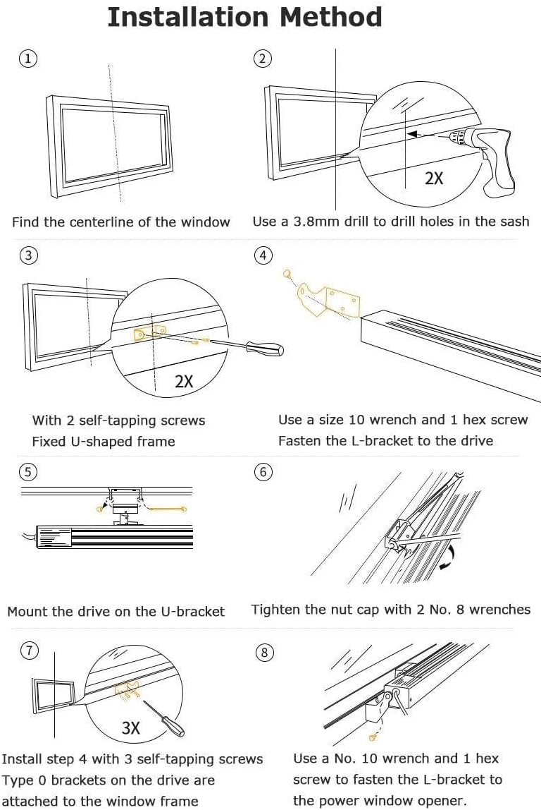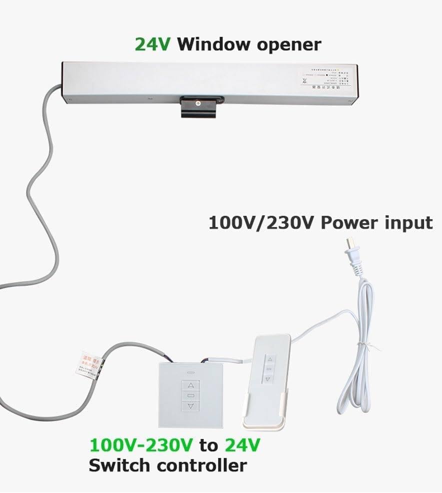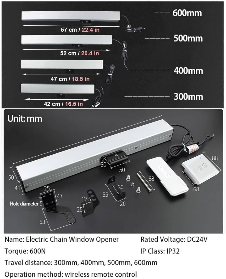 Motorized window openers open or close windows remotely through a wall switch or remote control. When the window opener is closed, the window is automatically clamped to achieve the effect of locking the window. 【PRODUCT FEATURES】: Adopts carbon fiber and metal chain, low noise design, double-layer chain, single-direction bending. The casing is made of aluminum alloy. The chain is made of stainless steel. Lif-eti-me load design opens and closes more than 10,000 times, low noise when powered on. The locking force is 400N. This actuator helps disabled people and elderly people with limited mobility to open windows easily. Can be used with a wind and rain sensor (not included). 【PRODUCT SPECIFICATIONS】: Rated power: 24W Operating current: 1A Protection level: IP32 Pushing and pulling force: 400N (40kg) The longest chain distance: 300mm, 400mm, 500mm, 600mm, 700mm, 800mm, 1000mm Operating speed: 10mm/s Operating temperature: -10℃~75℃ 【PACKAGE CONTENTS】: DC 24V window opener motor Mounting brackets 1 x remote control + 1 x wall switch. 【NOTES】: 1. The size is measured manually, the error is 1-3 cm, thank you for your understanding and support 2. Requires professional installation