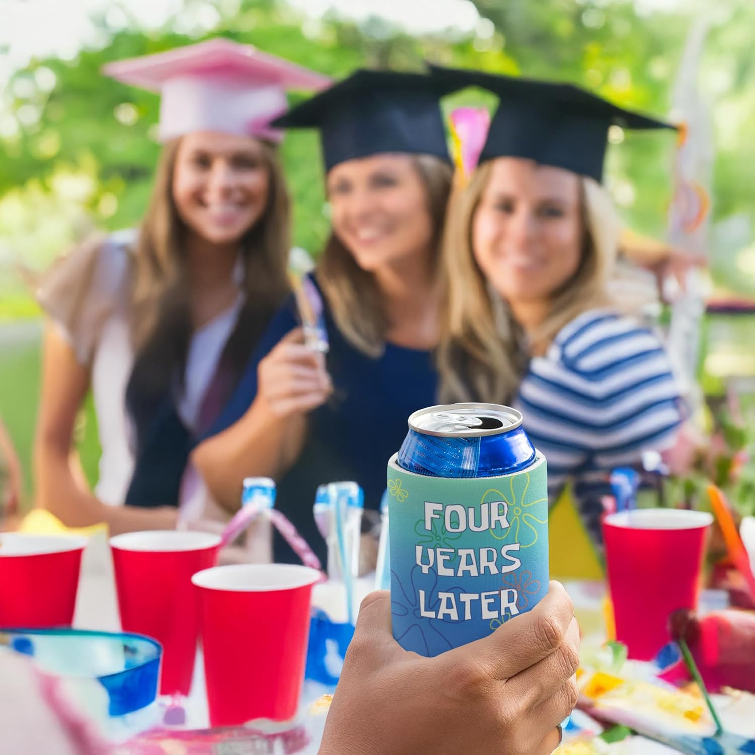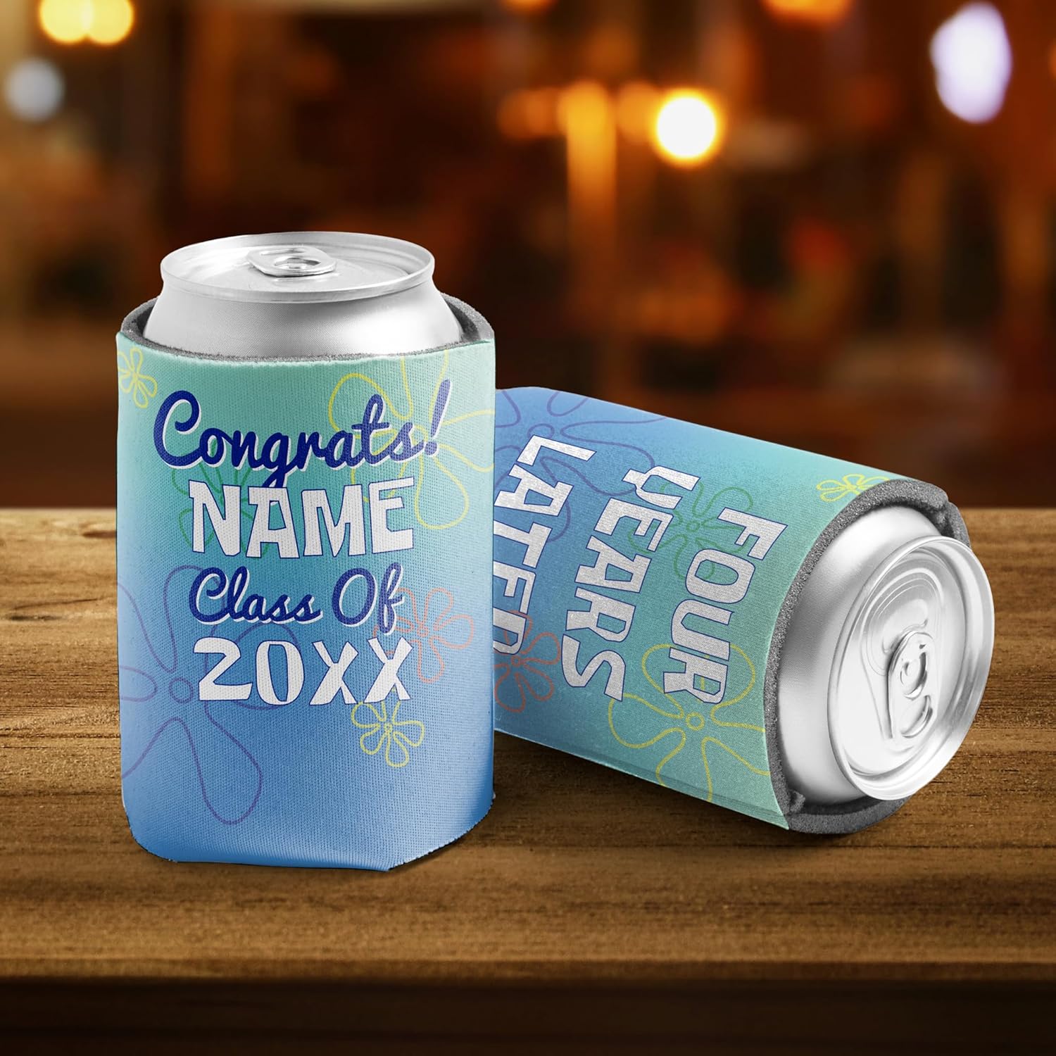 Make your graduation celebration memorable with this 25-pack of custom can coolers featuring the “Four Years Later” design. Each cooler can be personalized with a name and class year, creating a thoughtful keepsake for guests. Made from high-quality foam with a polyester outer layer, these sleeves are designed to help insulate your drink and keep hands dry. They're foldable, washable, and perfect for 12 oz cans and a range of bottle sizes. Great for graduation parties, open houses, and other gatherings. Manufactured in the USA by VictoryStore, a family-run business focused on quality and creative party supplies.