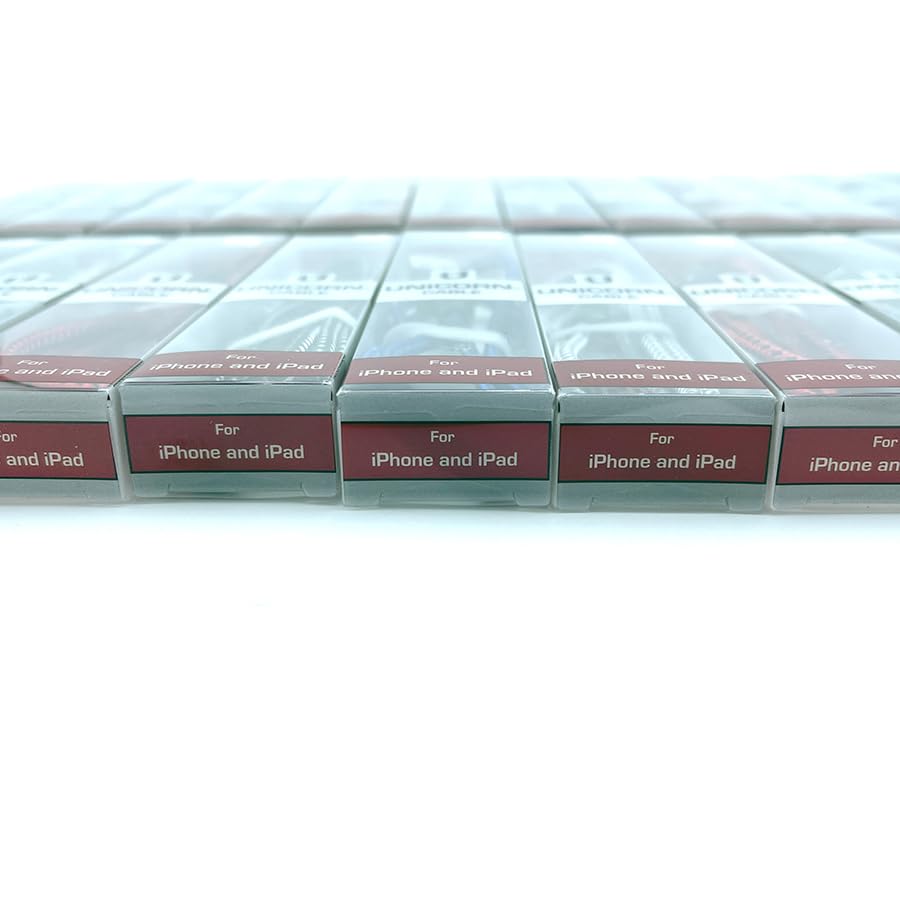 SUPREME CABLE FOR iPHONE SERIES 14 or EARLIER | STANDARD USB TO 8-PIN | 1m/3.3ft | FAST CHARGING | 4-5 COLORS | 25 CABLES UNICORN CHARGE: Experience charging like never before with Unicorn's Supreme Cables – the pinnacle of reliability, durability, and speed. Crafted with precision and covered in a high-quality nylon braid, these cables are designed to revolutionize your charging experience. ULTIMATE DURABILITY:Built to last, these cables boast a design 1.5 times more durable than standard cables and twice as durable as third-party alternatives. Multiple copper wires, a thick Aluminum shell, and a tangle-free nylon fiber braided jacket provide unparalleled protection against wear and tear. FASTER CHARGING: Turbocharge your charging routine with speeds up to 50% faster than similar third-party cables. Say goodbye to waiting around for 5-6 hours and hello to seamless power-ups. PREMIUM PLUG: Enjoy a perfect fit every time with our premium quality 8-Pin lighting plug. INSTANT RESPONSES:Bid farewell to frustrating error messages. Our cables deliver 100% responsiveness ensuring a hassle-free experience every time. UNICORN'S QUALITY ASSURED: Tested on multiple devices, rest assured that you're getting top-tier performance with every charge. RETAILER FRIENDLY: Simplify tracking and inventory management with our barcode-equipped cables, designed for seamless integration into your retail operation.Elevate your charging game with Unicorn's Supreme Cables – because when it comes to powering your devices, accept nothing less than perfection.