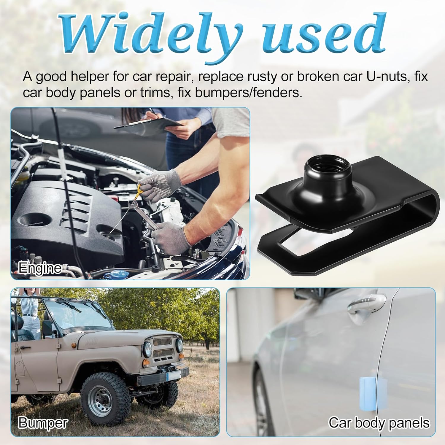 DESCRIPTION:Name: U Clips NutsQuantity: 25 PiecesMaterial: SteelWeight: 116gPackaging size: 13*9*1.9cmPACKING LIST: 25 pieces u clips nuts
