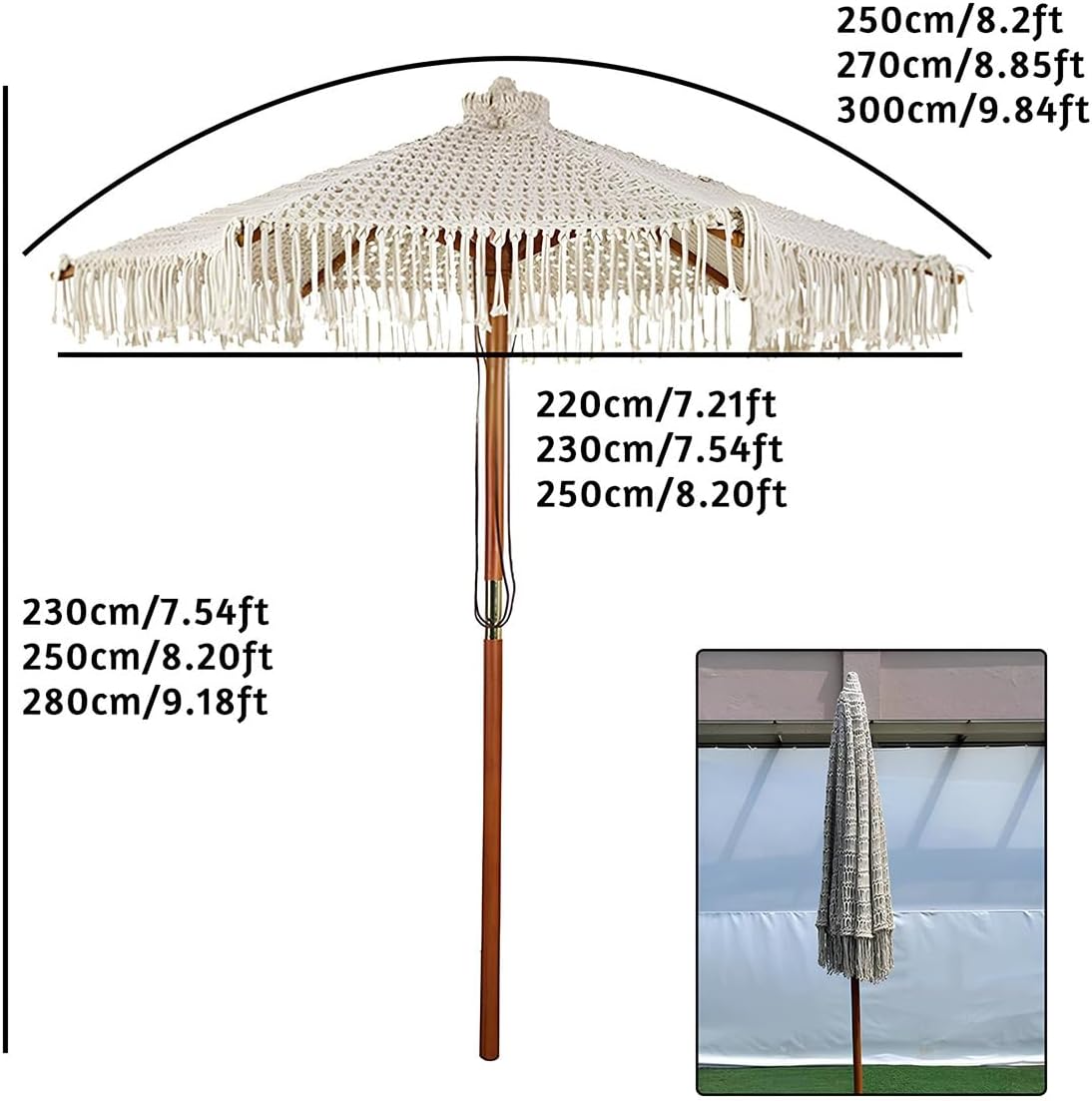 Bringing you a Bohemian style decorative garden parasol that combines practicality and artistic beauty. This 2.50, 2.70 or 3.00 meter diameter hollow woven beach umbrella is made of polyester-cotton rope and New Zealand pine wood.[Exquisite materials and craftsmanship]High-quality materials: High-quality polyester-cotton rope and New Zealand pine wood are used as the main materials. The middle rod size is 48mm, which is sturdy and stable, ensuring that it is not easily damaged after long-term use.Design: The umbrella cloth adopts a braided rope hollow design, with tassel trim, adding an exotic and romantic atmosphere to the space.Rope pulley function: Equipped with a convenient rope pulley mechanism, it makes opening and closing the parasol easy and convenient, greatly facilitating the user's daily use.[Multi-functional scene application]Whether it is placed in the backyard of the home, by the pool, or for outdoor picnics and beach vacations, this Bohemian style parasol can be used. Its exquisite design not only provides practical sunshade effects, but also serves as a decorative element to enhance the beauty and atmosphere of the overall space.【Specification Selection】We offer three different diameter sizes (2.50m, 2.70m, 3.00m) to meet the needs and preferences of different users.