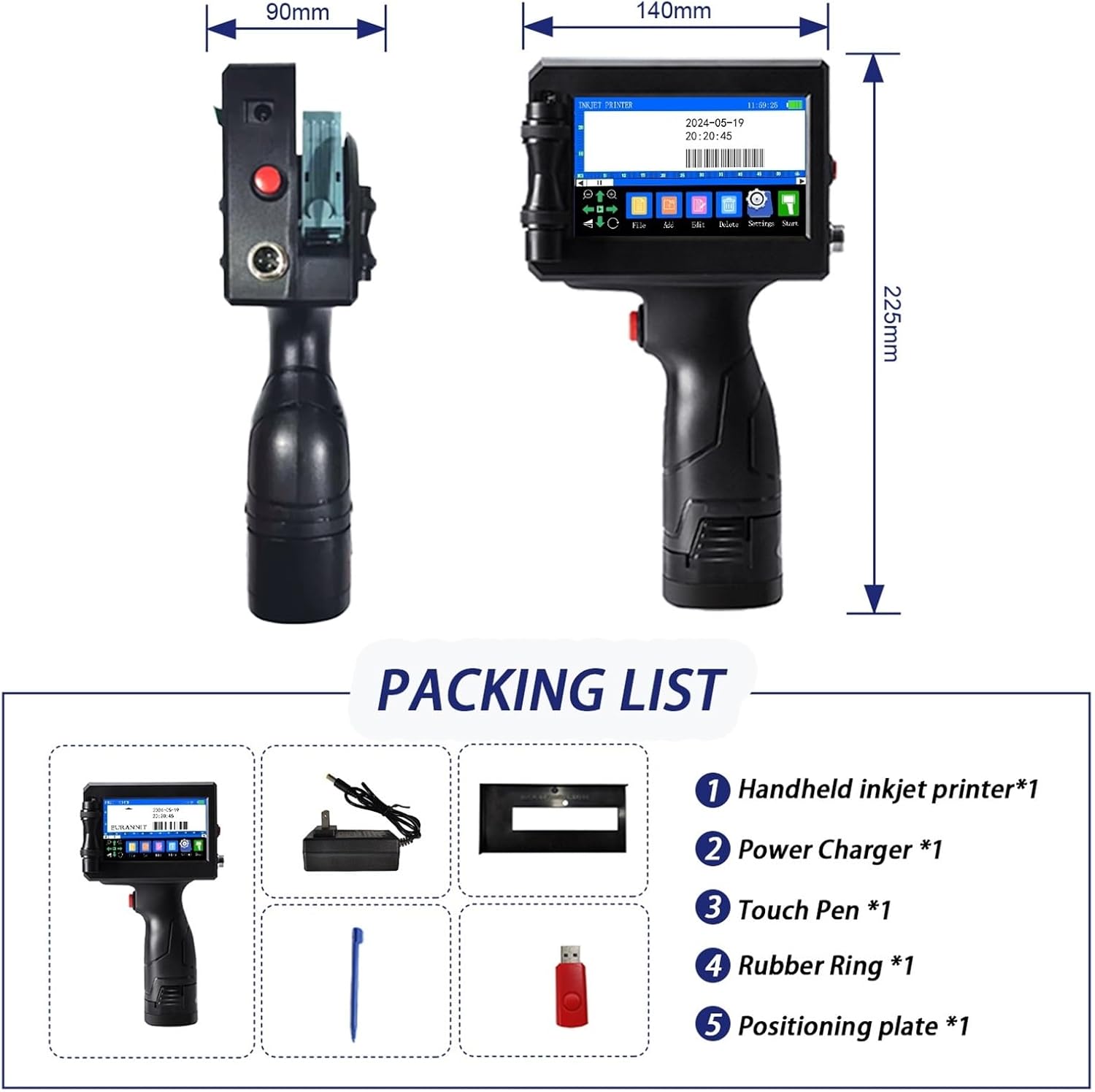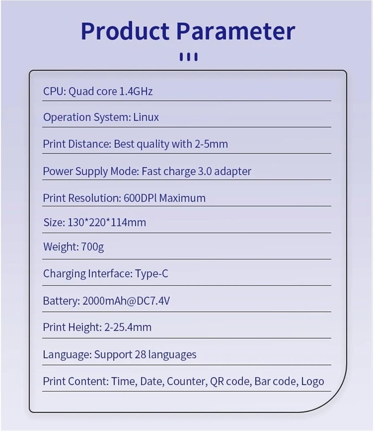 Product Description:Product Name: Handheld Inkjet printerPrint Head: Thermal Inkjet 2.5CPU: Quad Core 1.4GHzOperation System: LinuxPrint Distance: 2-5mmPrint Resolution: 600dpi MaximumWeight: GW 0.7kgDimension: 220*130*114mmMaterial of Printer: ABS+PCPrint Height: 2-25.4mmSystem Language: 28 LanguagesPrint Content: Time, Date, Counter, QR code, Barcode, Logo, etc.Printing Material: Wood, Carton, Pipe, Cable, Metal, Plastic, Uneven surface, etc.