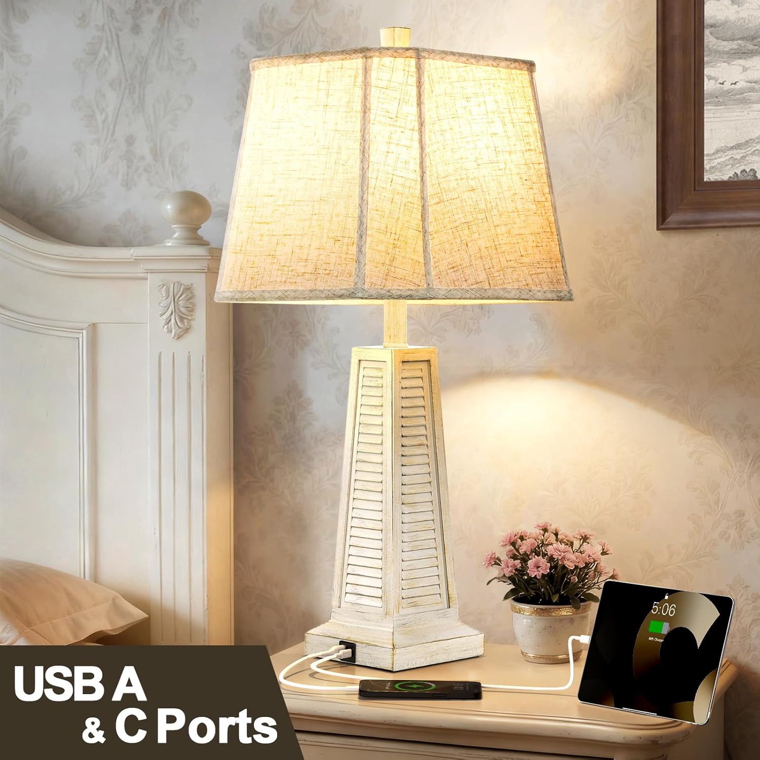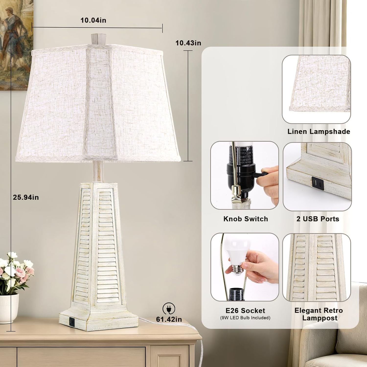 | Additional Features | 2 USB Ports, 9W Bulb Included, Knob Switch, Linen Lampshade, Vintage Resin Lamppost |