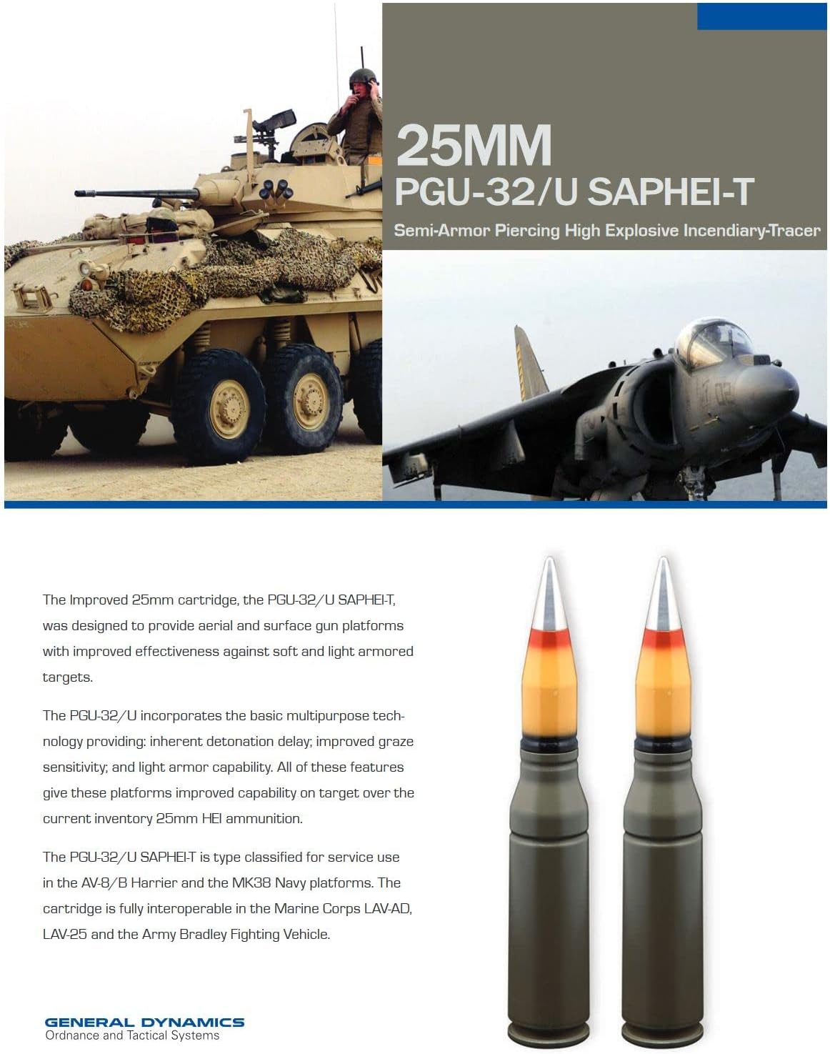 **HEAVILY DAMAGED PAINT** **PULLED FROM CASE** **PATINA!** TALKING PIECE **100% SAFE & INERT* *INERT* FOR DISPLAY OEM (Except Machined to Spec Tip) 6061-T6 Aluminum. 25mm Dummy Round Fired by the Bushmaster M242 Chain Gun. The M242 Bushmaster chain gun is a 25 mm (25×137mm) single-barrel chain-driven autocannon. It is used extensively by the U.S. military, such as in the Bradley fighting vehicle, as well as by other NATO members and some other nations in ground combat vehicles and various watercraft. Hughes Helicopters in Culver City, California, was the original designer and manufacturer. It is an externally-powered, chain-driven, single-barrel weapon that may be fired in semi-automatic, burst, or automatic modes. It is fed by a metallic link belt and has dual-feed capability. The term chain gun derives from the use of a roller chain that drives the bolt back and forth. The gun can destroy lightly armored vehicles and aerial targets (such as helicopters and other slow-flying aircraft). It can also apply suppression fire against exposed troops, dug-in positions, and occupied built-up areas. The standard rate of fire is 200 rounds per minute. The weapon has an effective range of 2,000 metres (6,600 ft),[5] depending on the type of ammunition used. With over 11,000 units sold worldwide, it is one of the most successful modern autocannons.[4] 25mm x 137 – PGU-32 Semi-Armor Piercing High Explosive Incendiary-Tracer (SAPHEI-T) The Improved 25mm cartridge, the PGU-32/U SAPHEI-T, was designed to provide aerial and surface gun platforms with improved effectiveness against soft and light armored targets. The PGU-32/U incorporates multipurpose technology providing: inherent detonation delay; improved graze sensitivity; and light armor capability. The PGU-32/U provides greater capability on target over the current 25mm HEI ammunition. The PGU-32/U SAPHEI cartridge is fully interoperable in the Army Bradley Fighting Vehicle and the Marine Corps LAV. The PGU-32/U is also type-classified for the AV-8/B Harrier and Mk38 Navy platforms.