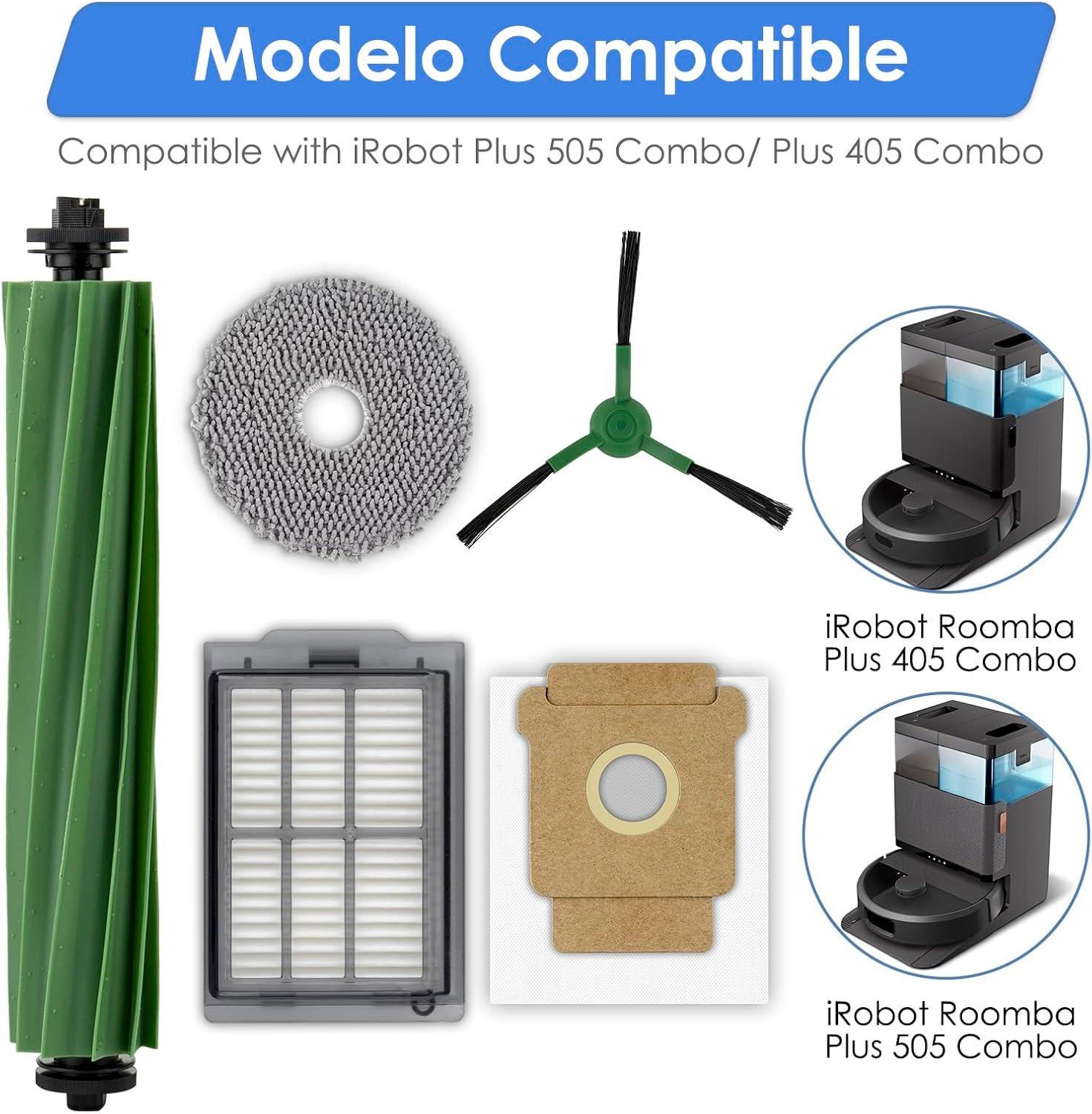 Accessories kit: 26 parts included: 2 roller brushes, 7 dust bags, 4 mop pads, 6 side brushes, 7 HEPA filters/ Perfectly compatible with iRobot Plus 505 Combo robot + AutoWash dock, Plus 405 Combo robotic vacuum cleaner/ Environmentally friendly