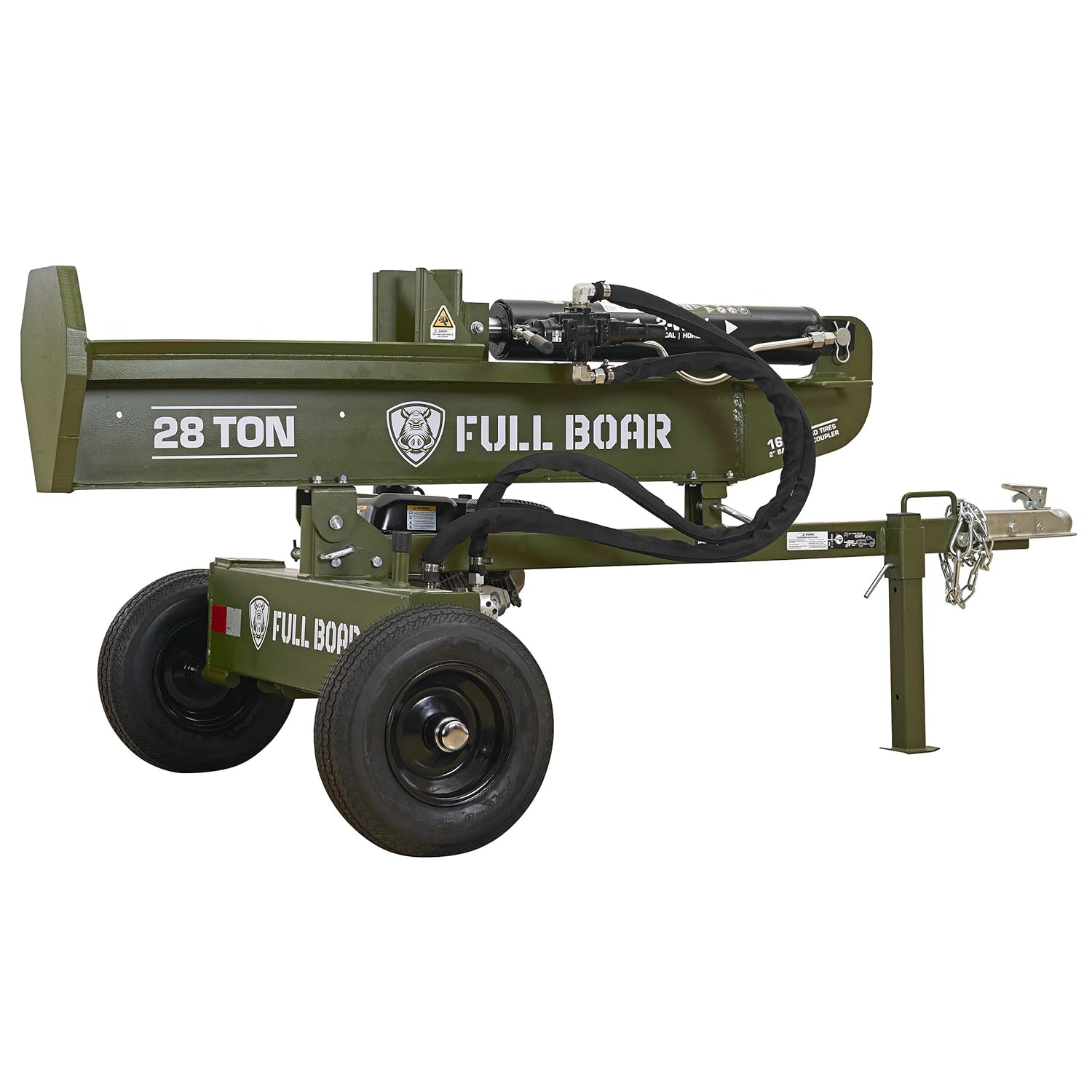 This H6028FB FULL BOAR Gas Powered log splitter let you take on the most demanding of log splitting jobs. At an Affordable price, it is rugged, compact and built for optimal power and durability. Engineered to get the most bang for your buck, the new Full Boar log splitters are designed with features that let you increase performance while saving time working effectively The backbone of this log splitter is a heavy-duty H-beam construction for a reduced beam deflection during log splitting. With a specially shaped 2-way wedge, a 10.9 second cycle time along a 22 and 3/4-inch stroke, you can easily and efficiently split logs up to 24 inches in length. For an added convenience, the hydraulic cylinder handle, smoothly pivots the machine from a vertical position to a horizontal position allowing you to roll and move heavier and larger diameter logs and position them in place without having to lift them. This 28 Ton log splitter has 16-inch diameter approved DOT road tires, and standard 2-inch ball hitch coupler with safety chains giving you the versatility of not being stuck in one spot and being able to tow it and do your splitting on site. Rugged. Affordable. Durable. It's time for you to GO FULL BOAR.