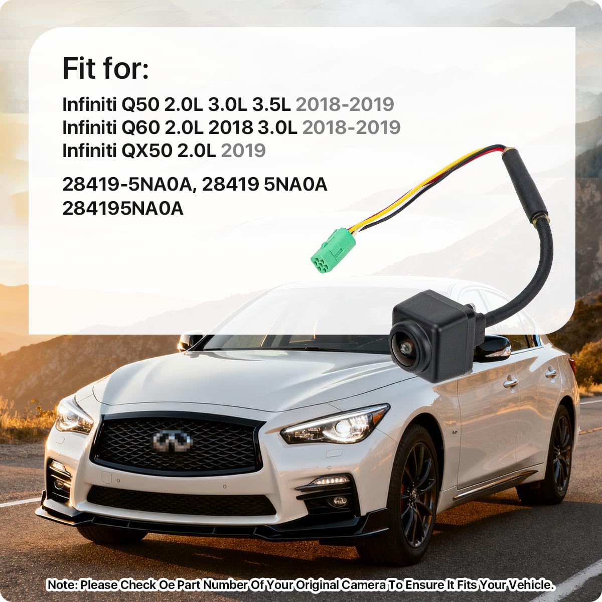 Aftermarket OE Backup Camera Replacement Compatible with Infiniti Q50 2.0L 3.0L 3.5L 2018-2019, Infiniti Q60 2.0L 2018 3.0L 2018-201, Infiniti QX50 2.0L 2019Please be aware that this backup camera is an aftermarket product instead of an OEM item. While it can be easily connected to your existing wire harness, please note that if your vehicle doesn't already have a backup camera system,this camera will not be compatible. For a seamless purchase, we highly recommend verifying that the part numbermatches the one you require before making your order to ensure compatibility with your vehicle.Infiniti Q50 2.0L 3.0L 3.5L 2018-2019, Infiniti Q60 2.0L 2018 3.0L 2018-201, Infiniti QX50 2.0L 2019Replacement Part Numbers:28419-5NA0A, 28419 5NA0A, 284195NA0ANOTE: Installation instructions are not included, professional guidance is recommended.This reversing camera is a replacement part. This rear-view backup camera is not an original part, brand names and model designations are mentioned for compatibility demonstration only. Contact your local dealer to confirm that the part number you are purchasing is an exact match before making your purchase. Before purchasing this OE backup camera, check the year/make/model dropdown and OE part numbers to confirm compatibility.How to Confirm the Right Model: Check Your Owner's Manual: Refer to your owner's manual for accurate information. Search "Year-Brand-Car Model-Owner Manual" online if needed. Check the Part Number: Examine the part number of your old backup camera for identification