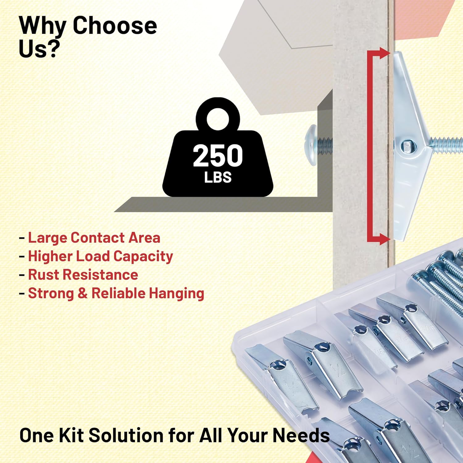 "Upgrade to Professional-Grade Toggle Bolts Tired of anchors that pull out of drywall? Our 28PCS heavy-duty toggle bolt kit provides industrial-strength support for heavy items (up to 100 lbs per anchor). Unlike flimsy plastic anchors, these metal hollow wall anchors distribute weight evenly, preventing damage to walls. Use for: Ceiling fixtures (lights, fans) Floating shelves & TV mounts Garage storage & HVAC installations Why Our Kit Stands Out: ✔ 3 Precision Sizes (1/8", 3/16", 1/4") for versatile applications. ✔ Wing Nut Design – Ensures a tight, wobble-free grip. ✔ Rust-Resistant Metal – Lasts longer than competitor’s coated bolts. Includes: 28 toggle bolts + wing nuts in a reusable case. Backed by a lifetime guarantee." Key Differentiators vs. Competitor: Weight Capacity: Explicitly states "100 lbs" (competitor omits this). Material Focus: Highlights "zinc-plated steel" (competitor doesn’t mention rust resistance). Use Cases: Adds "TV mounts, garage storage" (expands search reach).