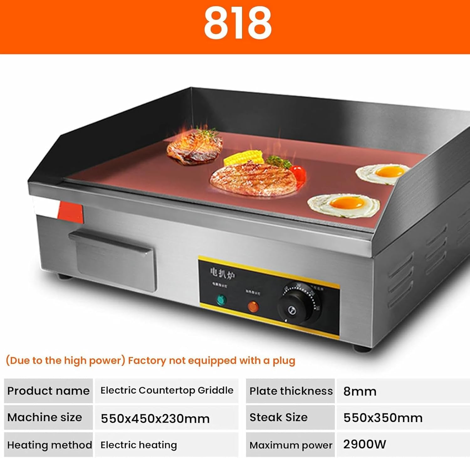 Business MachinesSpecification: Body structure: Stainless steel Temperature Control: 122°F to 572°F (50°C to 300°C) Voltage frequency: Power: 2900W Grill size: 550*350*8mm Product size: 550*460*230mm Weight: 18kg Package included: 1 x Electric Griddle Notes: 1-2cm error might exist due to manual measurements, please kindly understand. The colors deviation might differ due to different monitor settings. Tips 1. The temperature of the heating plate gradually decreases from the center of the griddle to the surroundings. 2. You can put the cooked food on the edge of the grill to keep it warm. Make raw meat or fried rice in the middle of a hot plate. 3. When not using the machine, please apply a layer of oil on the surface to prevent rust. 4. When cleaning with water, please pay attention not to pour water into the product, so as not to burn the wire.