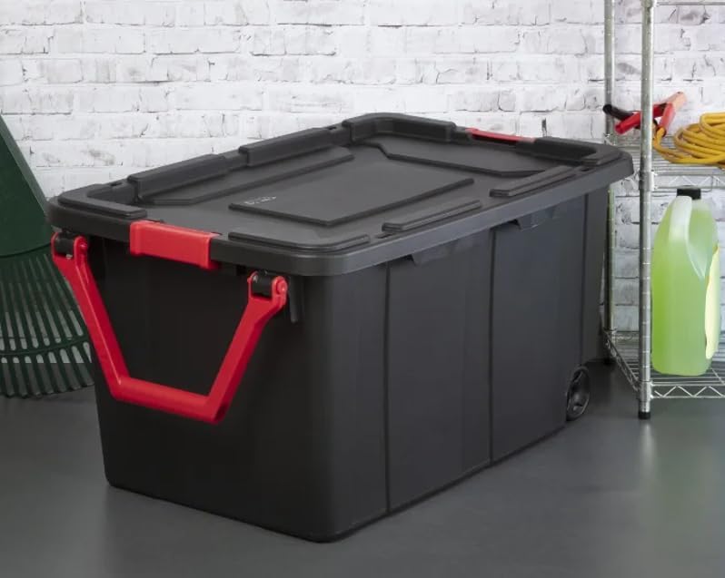 Bring order to garages, basements, and attics with the rugged design and unique features of the Industrial Tote line. Be confident that stored items will stay protected in the durable 40 Gallon Wheeled Industrial Tote, the ideal portable solution for storing larger and heavier supplies. The grooved lid design and keyholes provide options for tie-downs to simplify transportation, and keep totes in place in the back of a pick-up truck. The ergonomic handle rotates up for easy pulling while the large wheels and metal axle allow for rolling over rough surfaces. The innovative drip-resistant lid provides maximum protection against items getting wet, while the tight-fit lid keeps items contained. The robust latches offer extra security that the lid will stay attached to the base, and the textured surface makes for a sure grip when carrying. The deep recessed lids provide stability when stacking for efficient use of storage space. Channeled walls provide added strength and help to resist crushing under heavier loads. The 40 Gallon Wheeled Industrial Tote is ideal for more active storage needs, store camping equipment, sports gear, tools and workshop supplies, and other bulky items. 40 Gal. Wheeled Industrial Tote Plastic, Black, Set of 2: