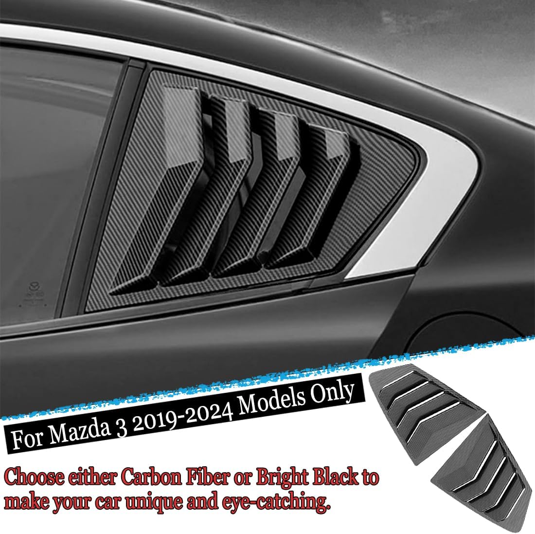 If you're looking to enhance the mundane interior accessories of your car, safeguard the original vehicle parts from unexpected scratches, and infuse your car's interior with a sportier vibe, make sure to carefully consider this collection of interior decorative。 Fitment: Suitable for MAZDA 3 2019 2020 2021 2022 2023 2024. Features: Brand new. Materrial: ABS plastic. Installation method:The back of the product comes with double-sided adhesive forautomobiles, which is easy to install, firm and not easy to fall off.Quick and hassle-free installation process. Package content: 2PCS Print Rear Side Window Louvers Cover Trim -carbon fiber Please note: Before installation, please compare the vehicle parts and the product to ensure they are consistent. Step 1: Start by cleaning the original vehicle parts thoroughly. Step 2: Wait for ten minutes to allow the surface to dry completely. Step 3: Preheat the adhesive part of the product to enhance the stickiness of the tape. Alternatively, use an adhesive promoter for a stronger bond when attaching the product. Step 4: Peel off the protective film on the product's adhesive tape and firmly press it onto the original vehicle part, applying force to ensure a secure attachment. Note: During the product installation process, avoid contact between the adhesive tape and water, as it may weaken the adhesive's effectiveness. Within two days of installation, refrain from cleaning the product with water or washing the car.