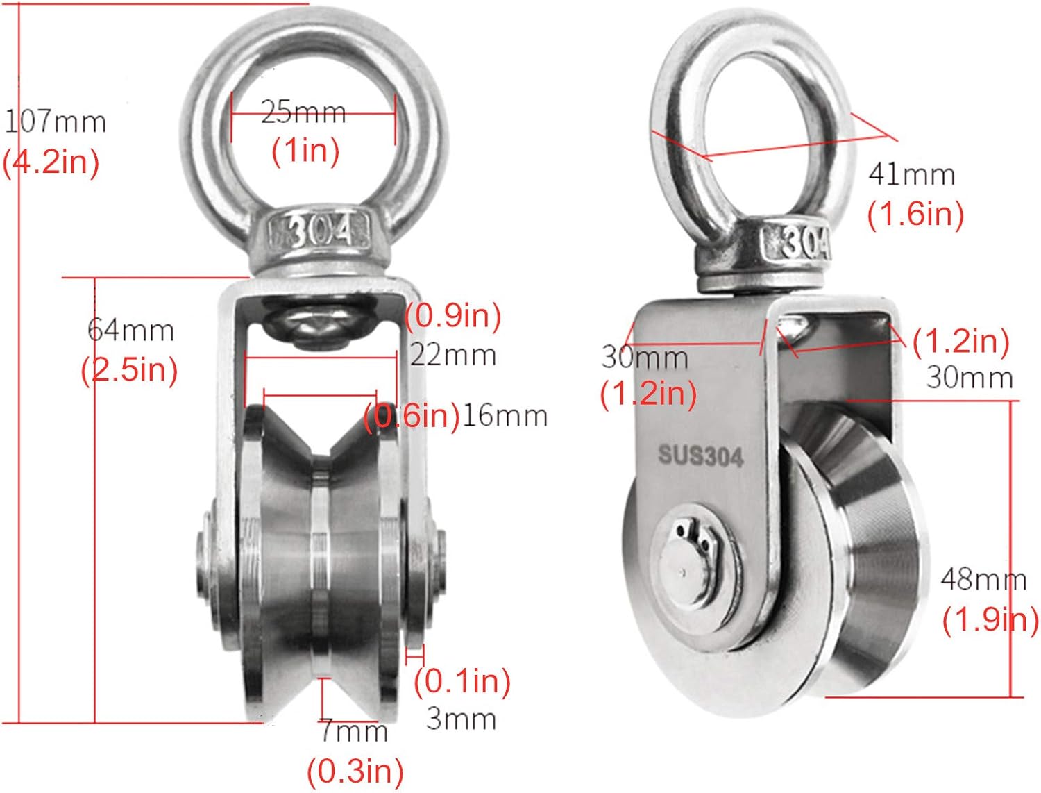 304 stainless steel pulley, the pulley group rolls smoothly. It has a highly robust structure, rust-proof, abrasion-resistant, scratch-resistant, exquisite appearance, and has a gorgeous luster. ◆The belt pulley is used to change the direction of the force, transmit rotary motion or achieve mechanical advantages in linear or rotary motion systems. The pulley is not suitable for synthetic fibre rope. Designed for use with ropes indoors and outdoors. Flexible sliding pulleys that can withstand heavy loads, suitable for many applications. 【Specification】Material: 304 stainless steelGroove: U-shaped groove, V-shaped grooveColor: silverSize: As shown in Figure 2Quantity: 2◆Wheel diameter: 48mm/1.9 inchesGroove width: 16 mm/0.6 inch, suitable for 3mm-8mm ropes. es.Load capacity: 0-2. 350 kg. Wheel diameter: 68 mm/2.7 inches. Groove width: 22 mm/0.9 inches, suitable for ropes of 12 mm-16 mm. Load capacity: 0-500 kg. Our products have been fully tested, inspected and packaged before delivery. You can rest assured to order. Happy shopping!2. Due to manual measurement, the size error is 1-2mm. Depending on the light and the screen, the colour may be slightly different. Please refer to the actual product. Thank you for your understanding.
