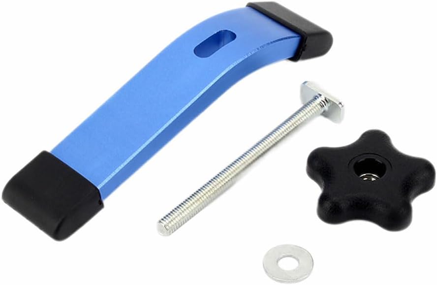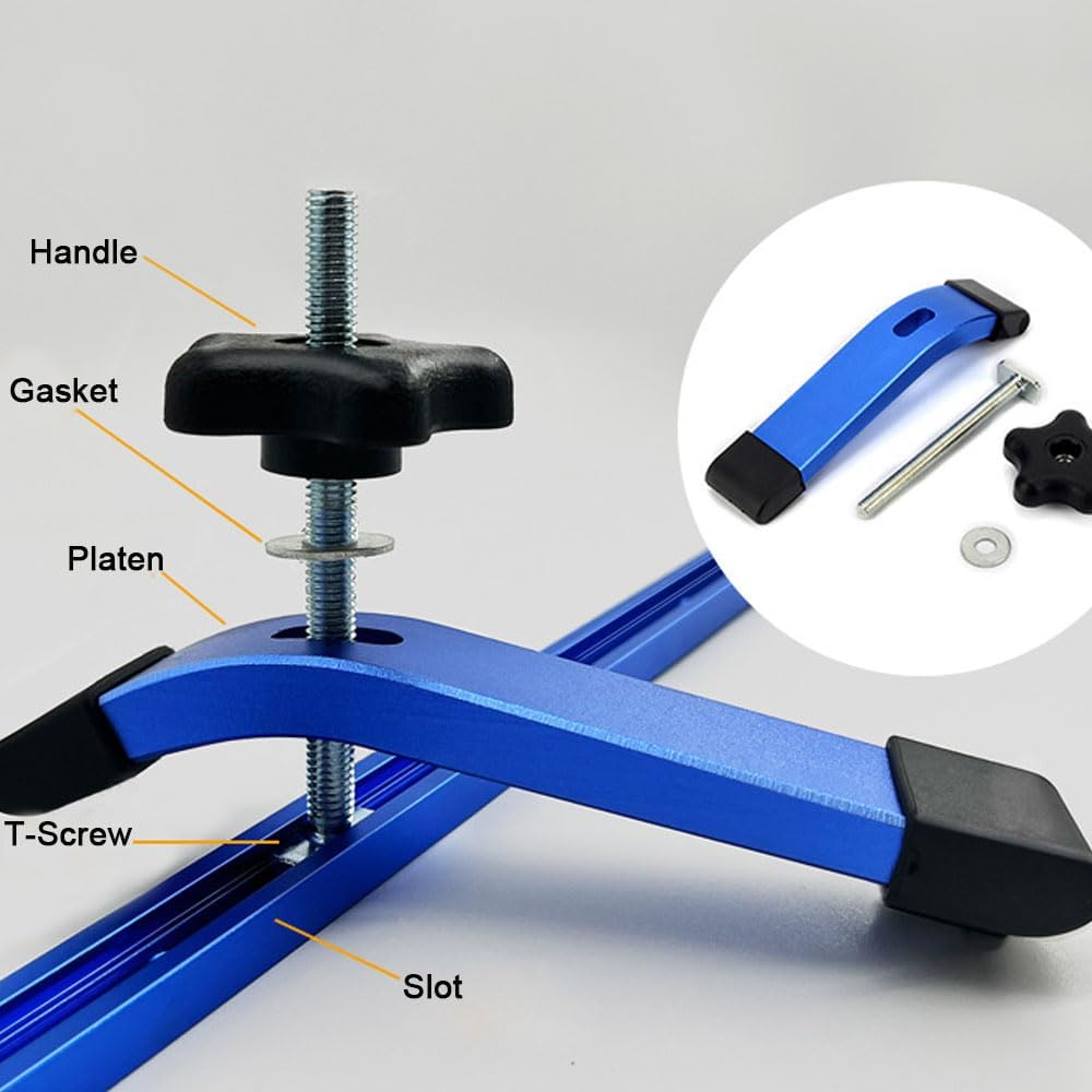 Easy to Use: The T-track fixture is designed for quick setup - simply tighten the black triangular button to secure the workpiece, and the T-track screws allow for smooth sliding in the slot. In addition, it supports easy and quick height adjustment to the desired fixing height of the workpiece.Sturdy and Durable: Constructed from high-grade aluminum, this T-track resists rust, warping, and wear, even with daily exposure to sawdust, moisture, or heavy use. In addition, it is not easy to scratch or bend and provide stable and reliable performance.Universal Compatibility: Compatible with standard T-bolts, hold-down clamps, miter gauges, and featherboards, this T-track integrates seamlessly with most woodworking tools. Suitable for use on workbenches, milling machines or saw tables, etc.Specification:Name: Woodworking Hold-down Clamp, Cross T-Track BracketMaterial: Aluminium AlloyPackage Included:2 * Hold Down ClampsOr1 * Cross T-Track