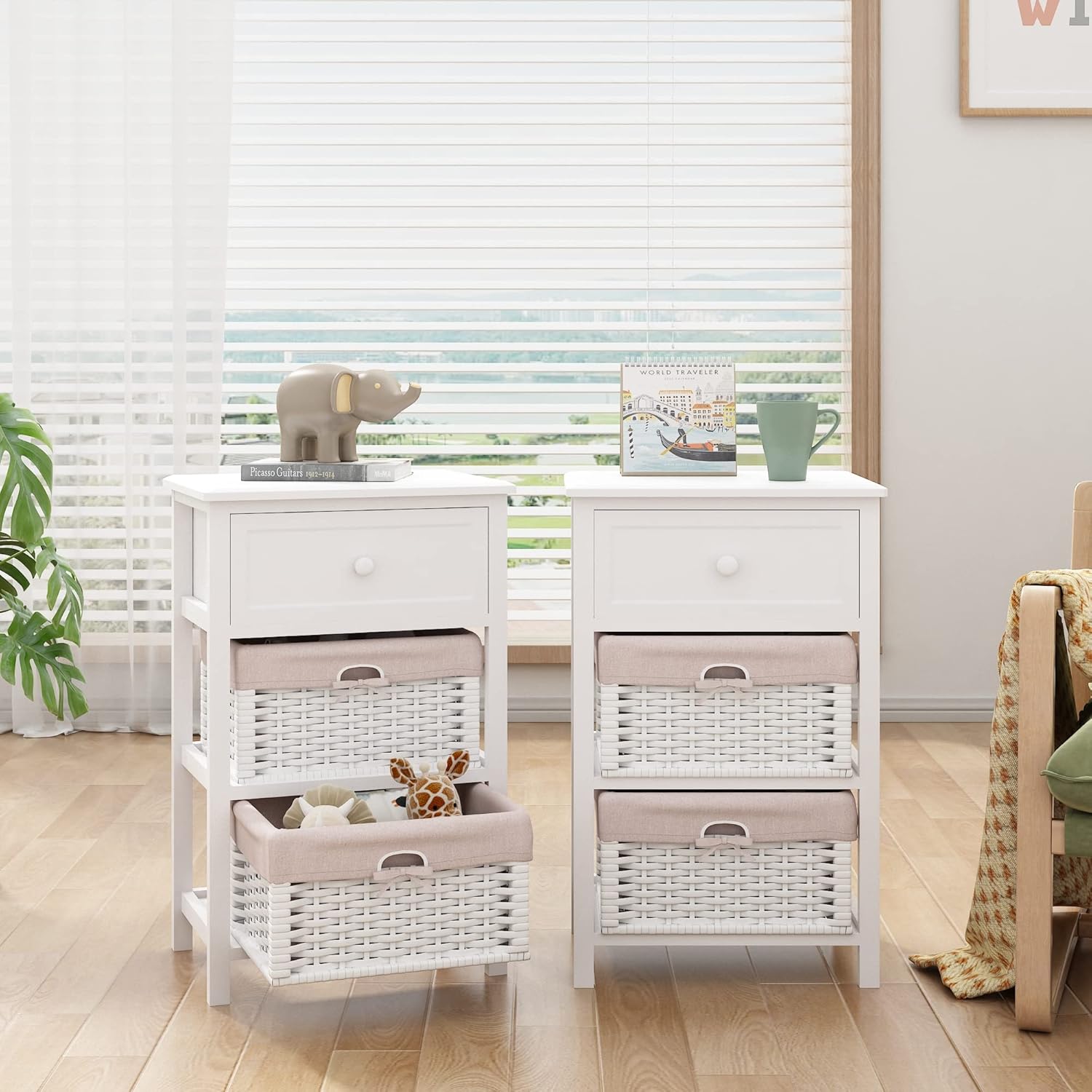 Description: This white wood 1-drawer end table nightstand with 2 wicker baskets is suitable for environmentalists who like neat and clean, because the raw materials are MDF and eco-friendly solid wood. Four legs help the table become more stable and can hold up to 190 lbs. With elegant and modern looks, no matter which room is placed in, this product will fit perfectly with any room style. The drawers with handles are the best place to receive small things, like pens, hair clips and headbands. The white desktop is more suitable for putting small appliances, like table lamps, ipads and remote controls. With a little water and a towel, you can easily clean the nightstand by yourself. Don’t hesitate to upgrade your living space with such a stylish and natural nightstand. Specifications: Color: White Main Material: MDF + Paulownia + Wicker Rattan Net Weight (of Each): 7.7/15.4 LBS Max Weight Capacity(of Each): 190 LBS Dimensions (of Each): 15.7”L x 11.8”W x 24.8”H Size of drawer: 12.3"L x 10"W x5.1"H Size of basket: 11.8"L x 9.4"W x 6.7"H Package Includes: 1/2 x Nightstand 2/4 x Wicker Basket 1 x Instruction Manual