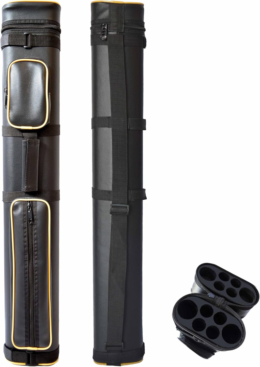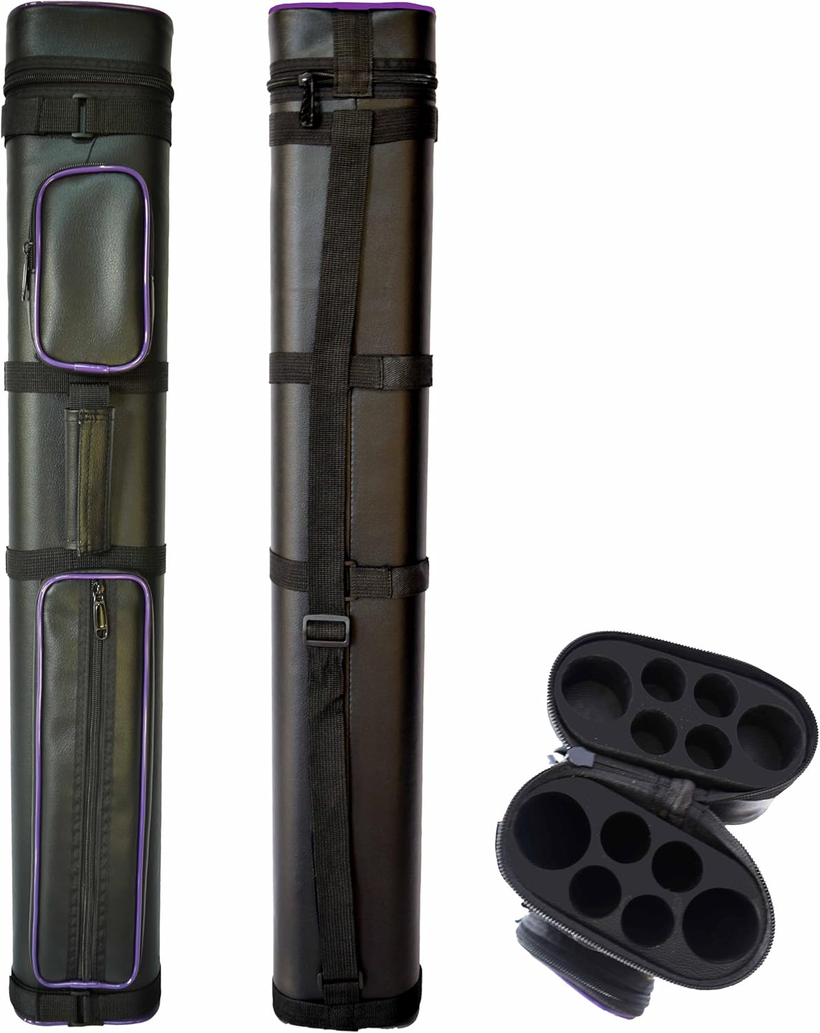 Vinyl covering Holds 2 butts and 4 shafts Adjustable shoulder strap Pocket to hold chalk, tips, etc. This item measures 32" in length X 5 1/2" X" 3 3/4" Small pocket measures 6" X 4" X 1 1/2" Large pocket measures 14" X 4" X 1 1/2" Divider tubes goes all the way into the case.