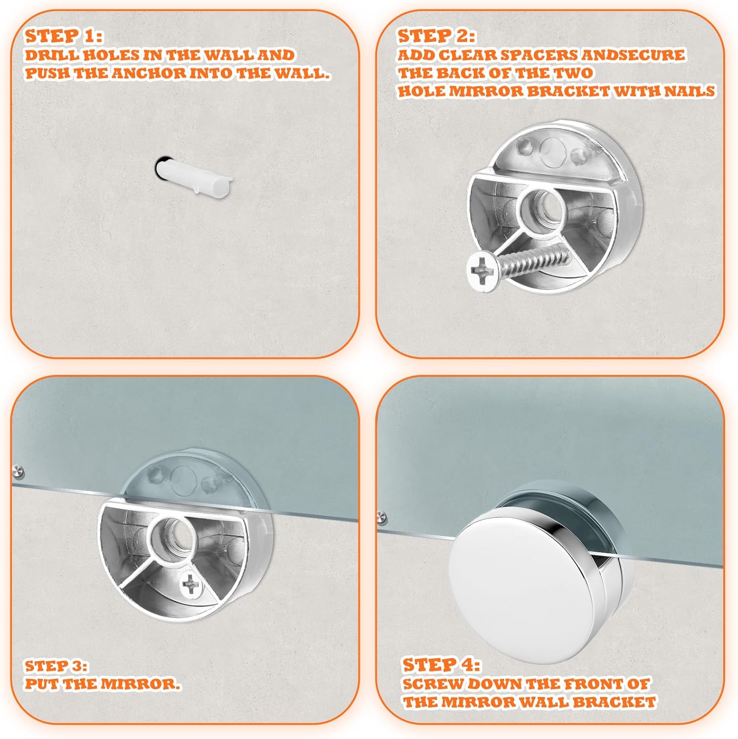Product name:Mirror fixing mounting clipMaterial: zinc alloy + plasticPacking list:4 Pack mirror hanging clips Kit with Heavy Duty Long Screws & Anchors