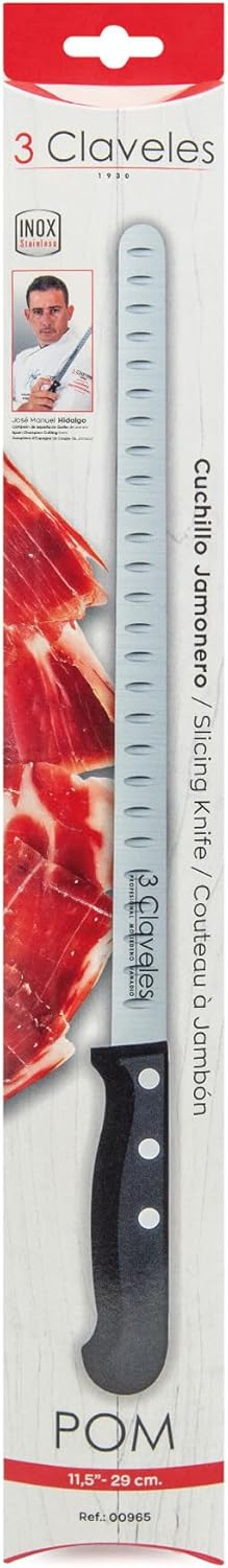 29cm Ham Knife Material: Stainless Steel; POM Handle Alveolate Narrow and more flexible honeycomb blade that allows you to extract fine lids for better tasting the ham as well as increasing performance. The honeycomb blade facilitates cutting by creating an air chamber between the blade and the food preventing the blade from being attached to the blade.