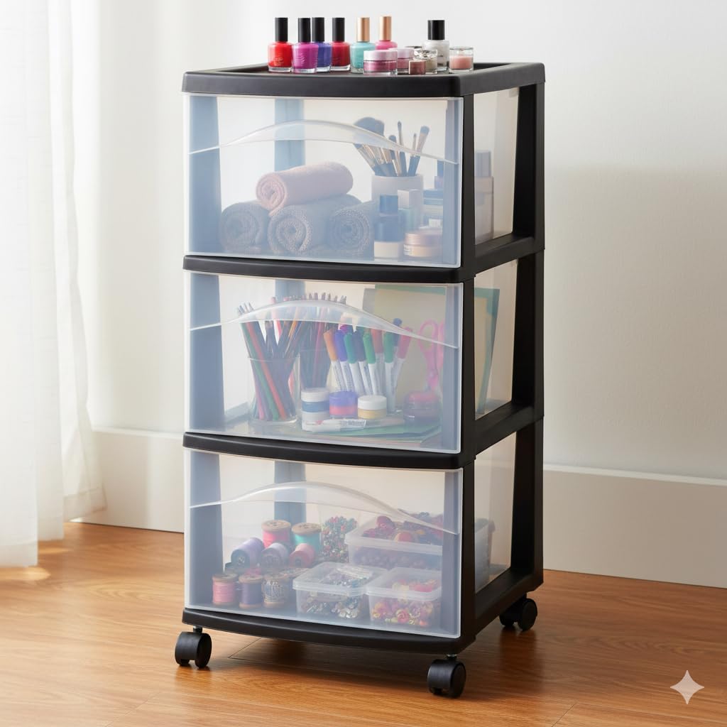 Keep your space neat and organized with this 3-Drawer Rolling Storage Cart, designed for versatile and efficient storage. Featuring clear plastic drawers, this organizer lets you quickly identify contents without opening each drawer. The compact vertical structure saves valuable floor space while offering ample storage for everyday essentials. Built with a durable plastic frame and smooth-glide caster wheels, this rolling cart is easy to move and perfect for multi-room use. Whether you need storage for office supplies, bathroom accessories, cosmetics, crafts, or household items, this cart delivers convenience, functionality, and modern simplicity. Perfect for homes, offices, dorm rooms, salons, and classrooms, this storage cabinet helps maintain a clutter-free environment with minimal effort.
