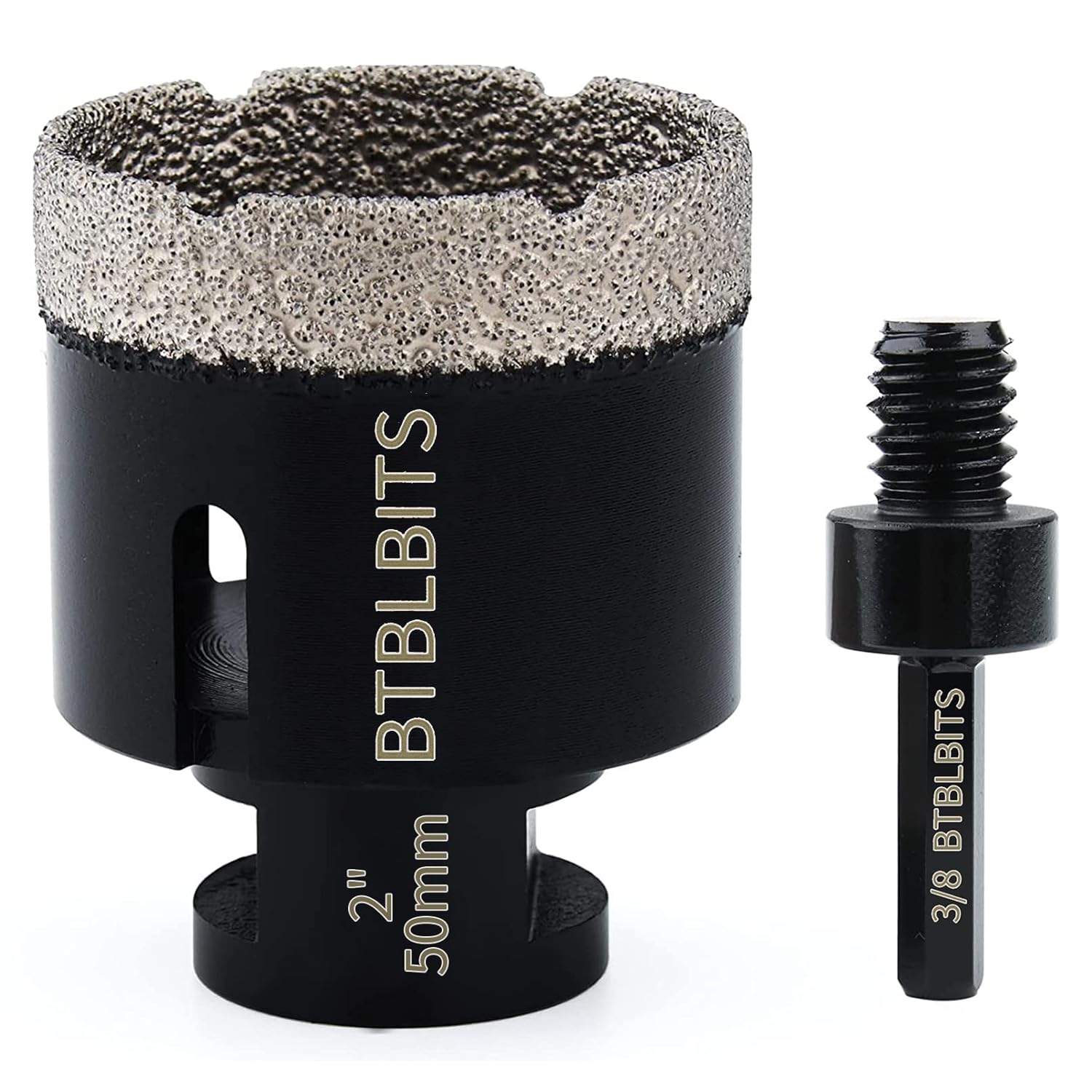 Package Content:1 pc BTBLBITS 3 Inch Porcelain Tile Hole Saws Vacuum Brazed Diamond Drill Bits 75mm with 3/8" hex shank drill adapterSize: Diameter 3" (75mm) , 5/8-11 Threaded, Diamond height 10mm, Total height 60mmRecommended Machine: Angle grinders and Electric drills (5/8"-11 threaded diamond hole saw for most angle grinders; with 3/8” hex drill shank adapter can fit in power drills)Cutting Method: Dry or Wet, Wet Drilling will prolong workable lifeApplication: Drilling Porcelain, Tile, Marble, Brick, Stones, Granite, Concrete, Ceramic, Masonry, Quartz, Countertop