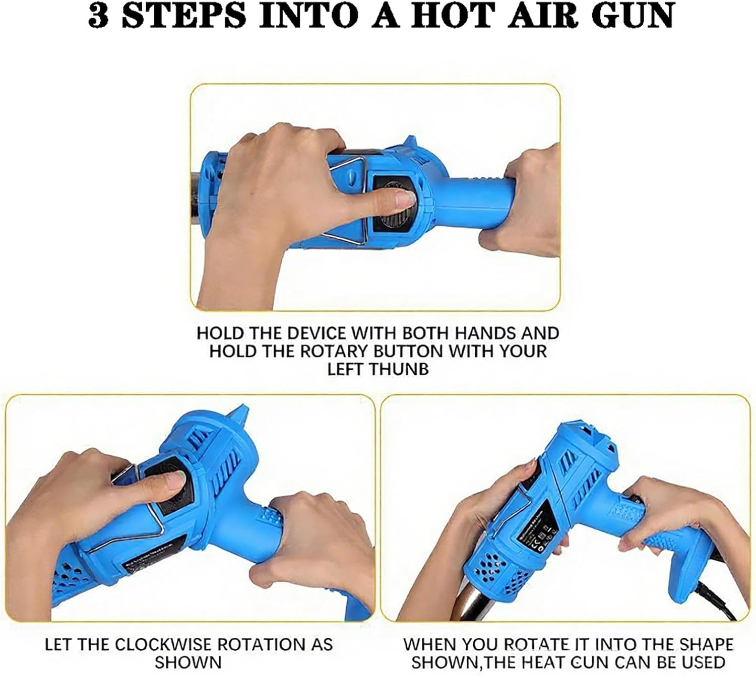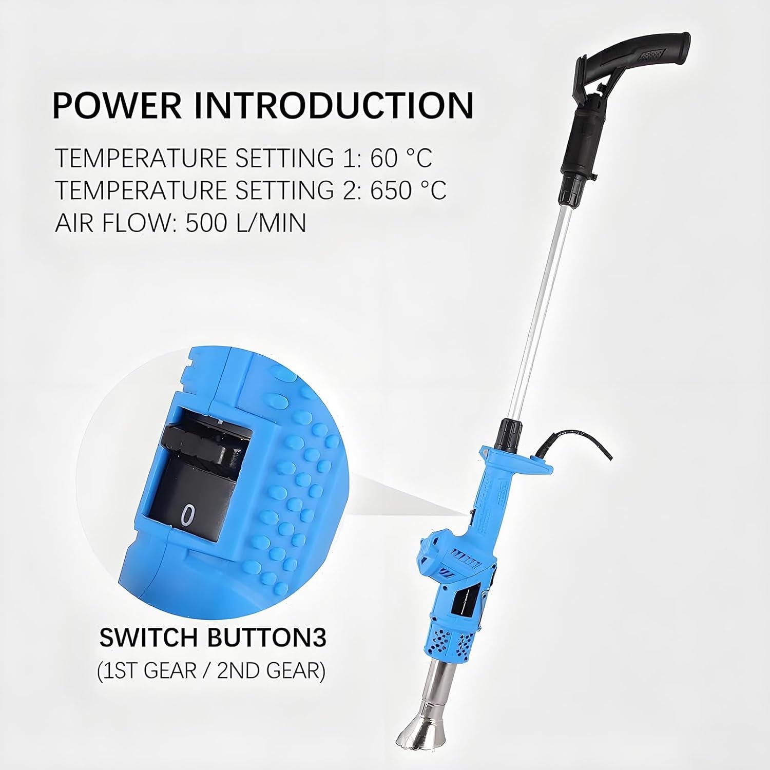 Temperature Setting 1: 80 °C/176℉Temperature Setting 2: 650 °C/1202℉Air flow: 500 L/minPower: 2000W1.8m H05RN-F 2x1.0mm2 rubber cableIncludes max 5 nozzles for different applications.3 in 1: grass burner function, charcoal ignition function, heat gun function (rotating head)