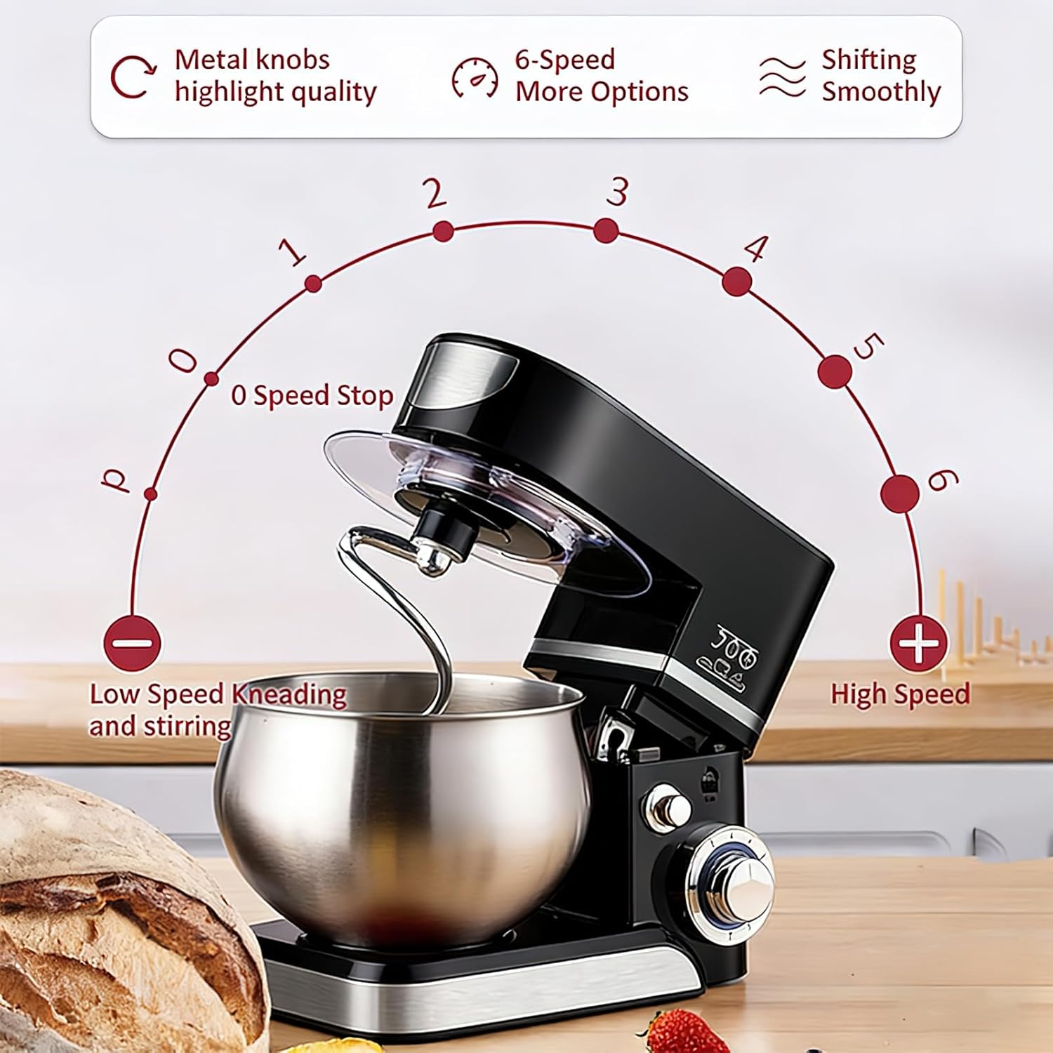 Complete your kitchen arsenal with dough hooks (bread/pizza), wire whisks (egg whites/cream), and flat beater (cookies/salads). A multifunctional solution that meets various mixed needs such as cakes, bread, cookies, pastries, pancakes, and waffles. Large capacity stainless steel bowl, suitable for family gatherings or entertaining friends. The splash proof kitchen blender is designed with a transparent pouring lid - easy to add additives during the mixing process and can prevent 93% splashing. This blender has 6 different speed options to meet your cooking needs at different stages, making it perfect for easily kneading dough, mixing cake batter or fresh cream. When the head is lifted, the power is automatically cut off, and the strong suction cups on the four chassis can keep the machine stable, avoiding movement or bouncing, ensuring safe operation even during heavy mixing.