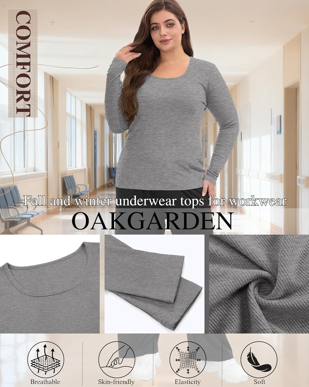 3 Pack Women's Plus Size Underscrubs Shirts, Cotton Ribbed Long Sleeve Scoop Neck Layering Slim Fit Tops for Nurse