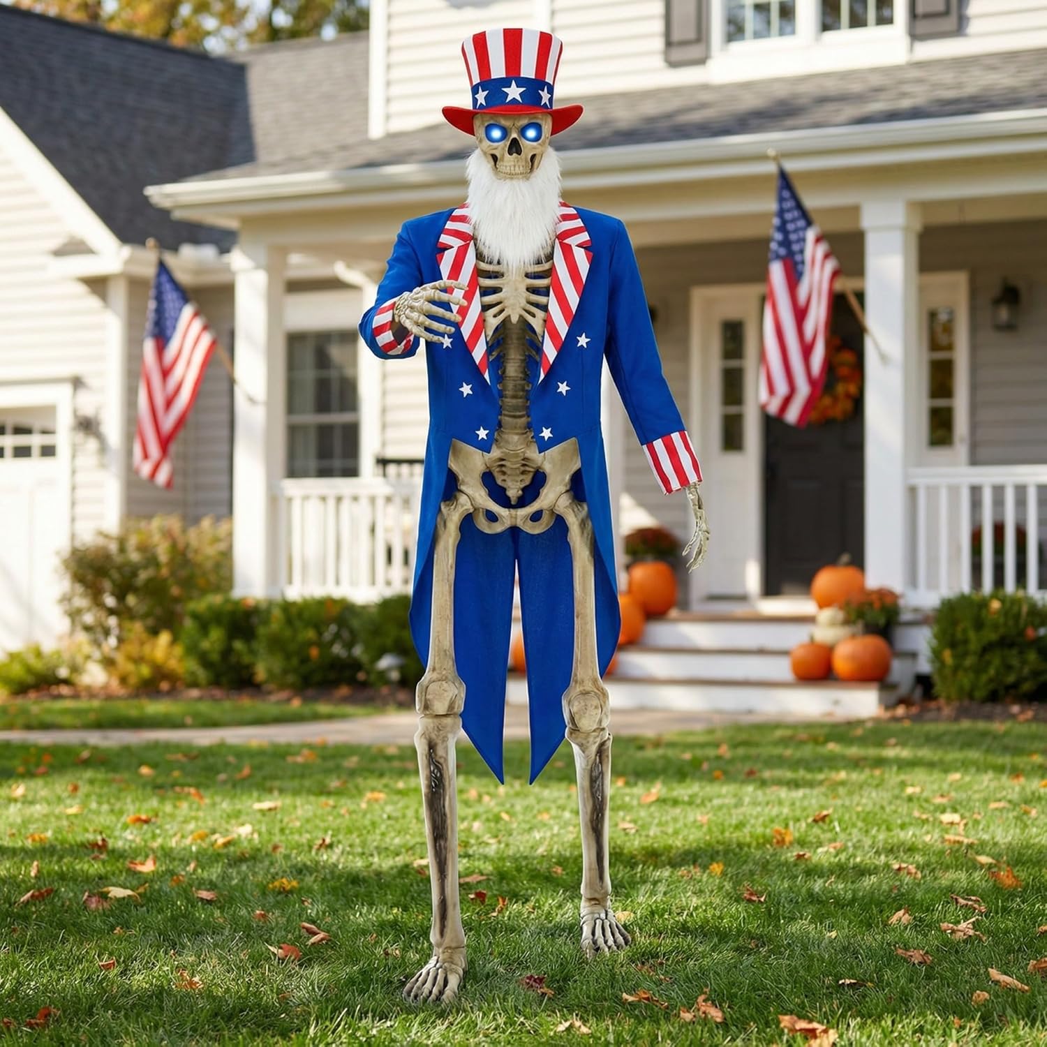 Bring some patriotic flair to your neighborhood! Our 12ft Skeleton Patriotic Uncle Costume is the ultimate way to dress up your oversized lawn friend. This high-quality 3-piece set is designed to turn heads and create a festive atmosphere for any American holiday. Features: Timeless Patriotic Design: Includes a detailed blue tailcoat with striped cuffs, a tall star-patterned hat, and a signature white beard for a complete, recognizable look. Precision Fit for Giants: Specifically tailored to match the proportions of 12-foot skeletons, providing a professional and polished appearance. Built for the Outdoors: Made from reinforced polyester that resists tearing and weathering, keeping the colors bright even under the sun. Safe & Lightweight: Carefully selected fabrics ensure the outfit adds minimal weight to your skeleton's joints and motors. Specifications: Material: Weather-resistant polyester fabric Dimensions: Designed for 12ft skeletons Color: Red, White, and Blue Package includes: 1 x Stars and Stripes Top Hat 1 x Blue Patriotic Tailcoat 1 x Classic White Beard Notes: Manual measurement, please allow slight errors on size. The color may exist a slight difference due to different screen displays.